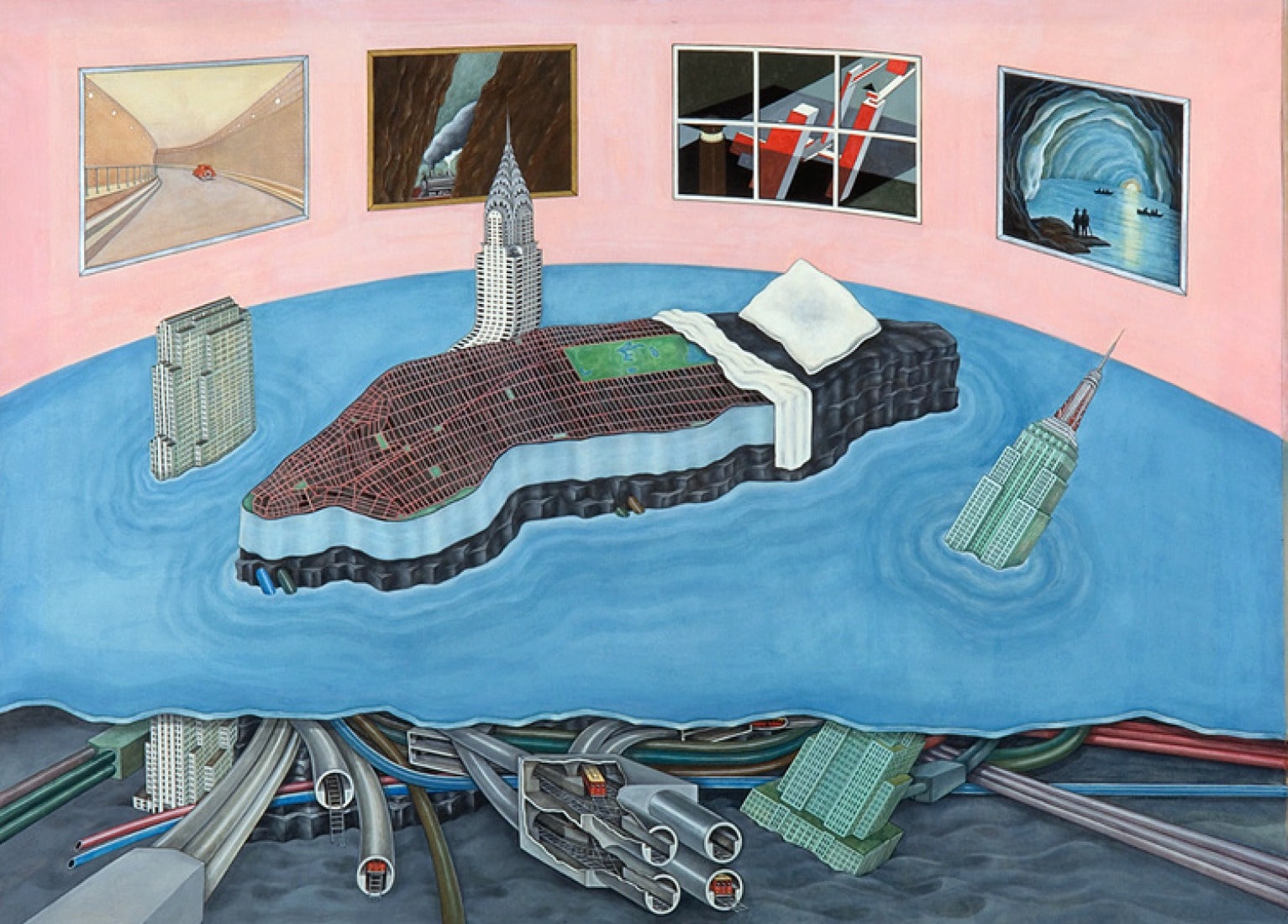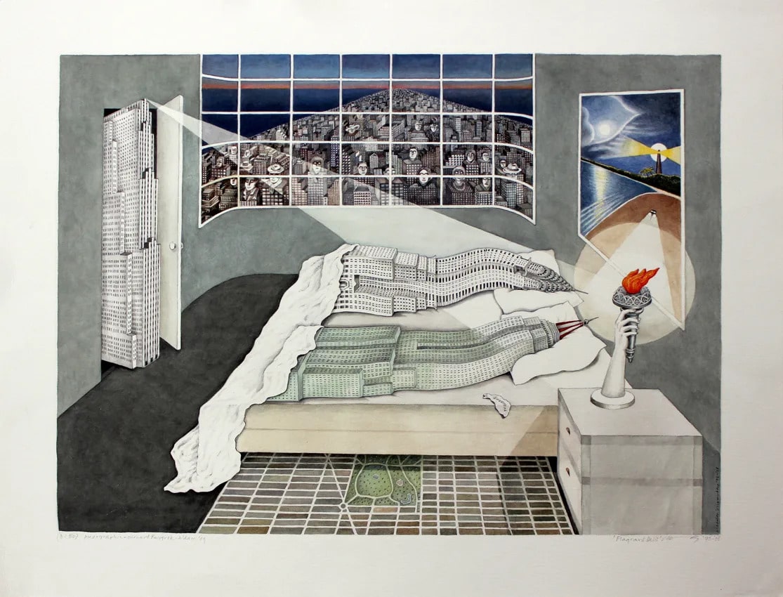 Her paintings often show buildings as if they had personalities or emotions, turning cold structures into living beings. One of her most iconic works, “Flagrant Delit,” shows the Empire State Building and the Chrysler Building lying in bed together, surprised by the Statue of Liberty shining her torch on them. This surreal and humorous image became the cover for Koolhaas’s book Delirious New York (1978) and quickly turned into one of OMA’s most recognizable symbols. The artwork perfectly captured the spirit of the time—where architecture was seen not just as construction, but as storytelling, fantasy, and culture.
