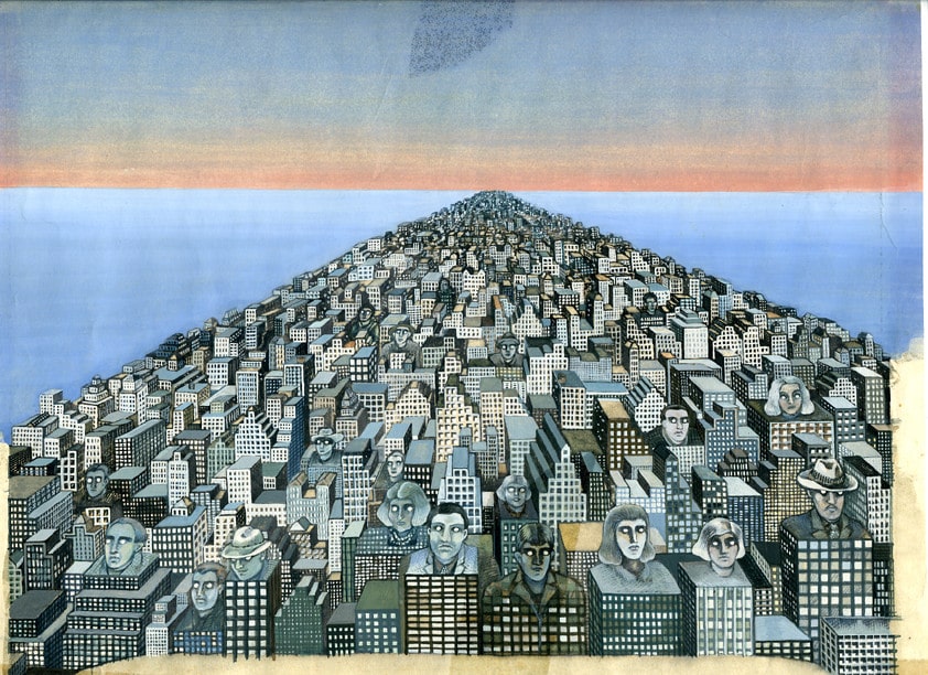 Born in 1945 in the Netherlands, Vriesendorp studied art and developed a passion for painting imaginative and emotional scenes. In 1975, she helped establish the Office for Metropolitan Architecture (OMA) together with Rem Koolhaas, Elia Zenghelis, and Zoe Zenghelis. While Koolhaas became known for his radical ideas about cities and buildings, Vriesendorp became famous for her playful, dreamlike artworks that gave architecture a human side.