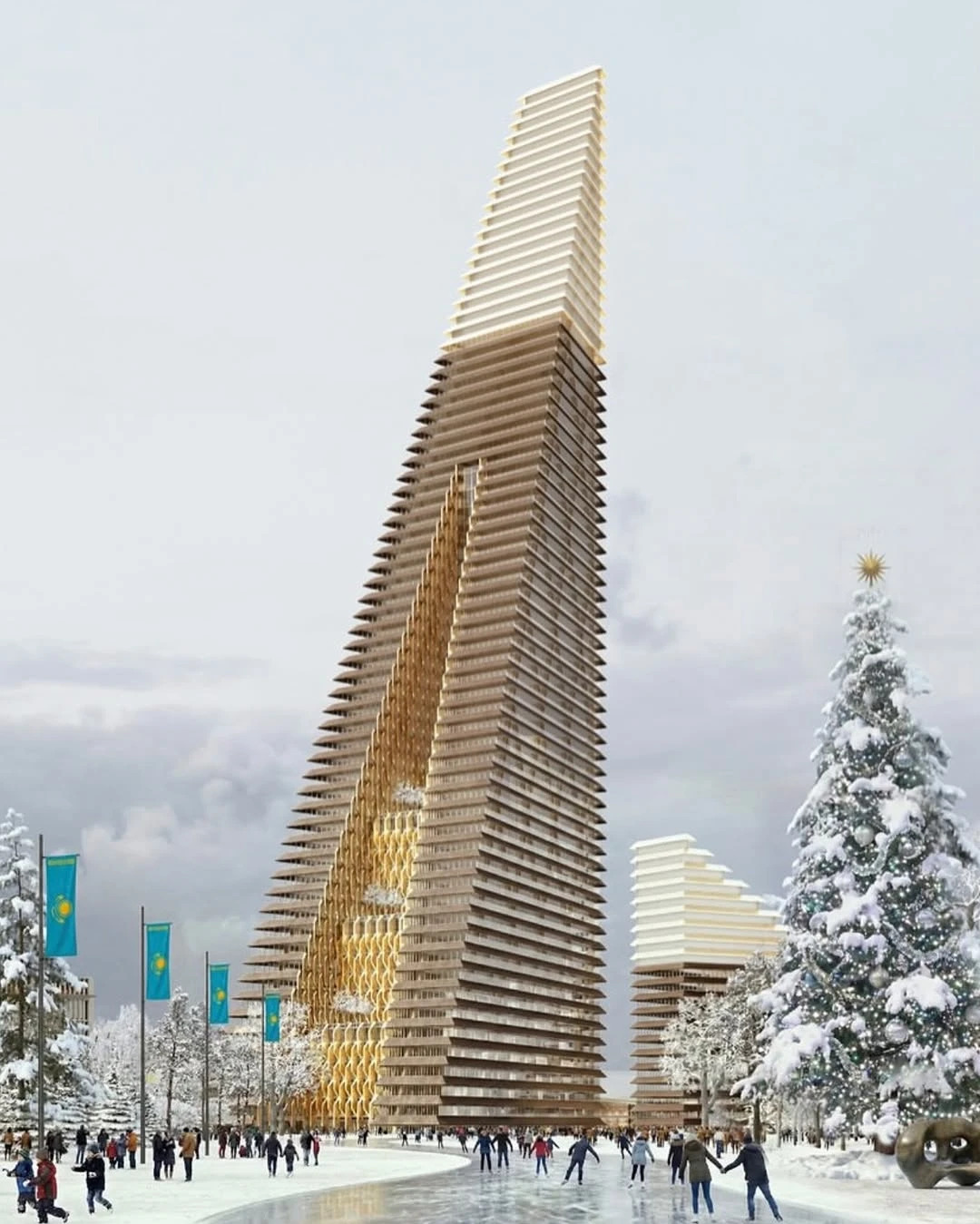 - The design derives its stepped, faceted form from the Trans-Ili Alatau mountain range, translating geological stratification and layered terrain into architectural massing and facade geometry.