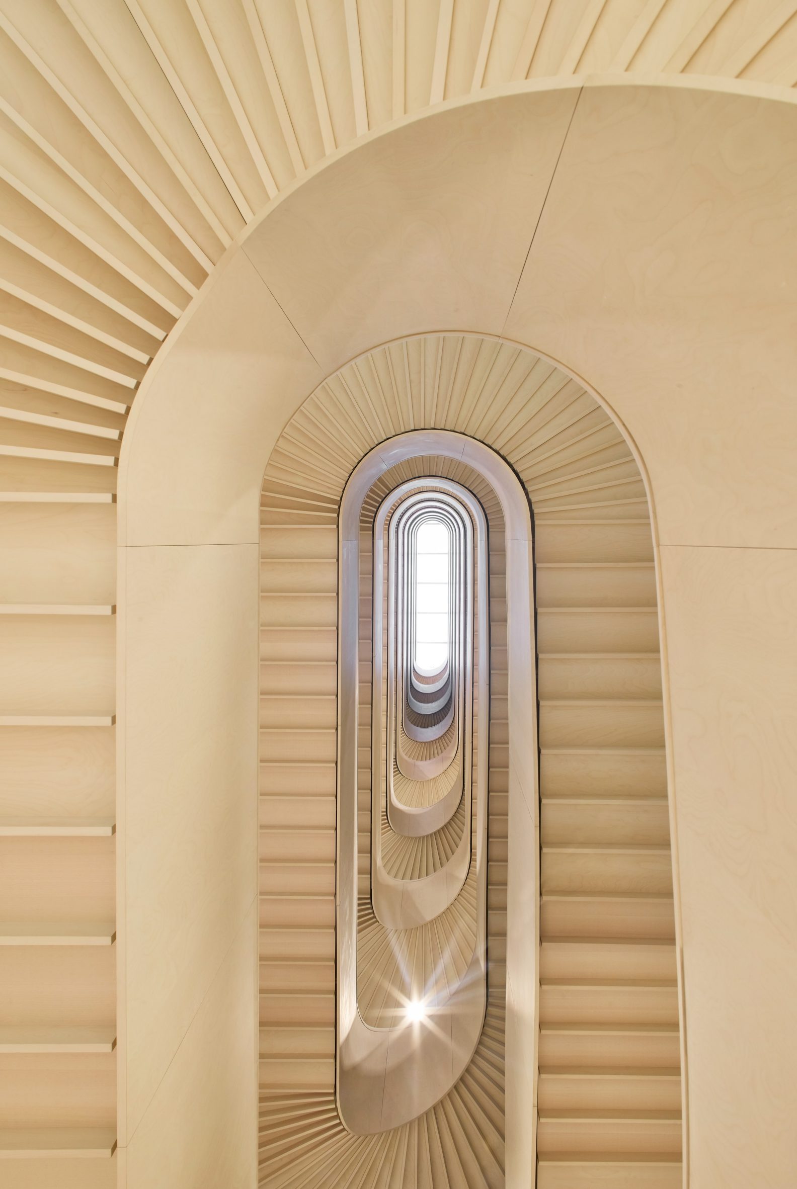 Inside, a 51-metre-tall glass pyramid atrium, known as the Pyramid Hall, serves as a luminous civic space and the building’s most memorable interior. This soaring void is the place where the government will greet foreign dignitaries and where citizens can glimpse the operations of the state. Covering one wall of the atrium is a 7,534-square-foot artwork, AahkA (Mother Earth), by Finnish-Sámi artist Outi Pieski. Constructed from Nordic birch poles, the installation celebrates indigenous Sámi culture and evokes the forests and natural landscapes of Scandinavia.