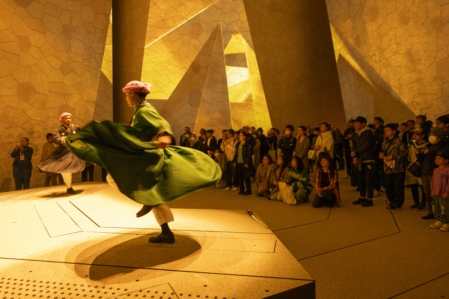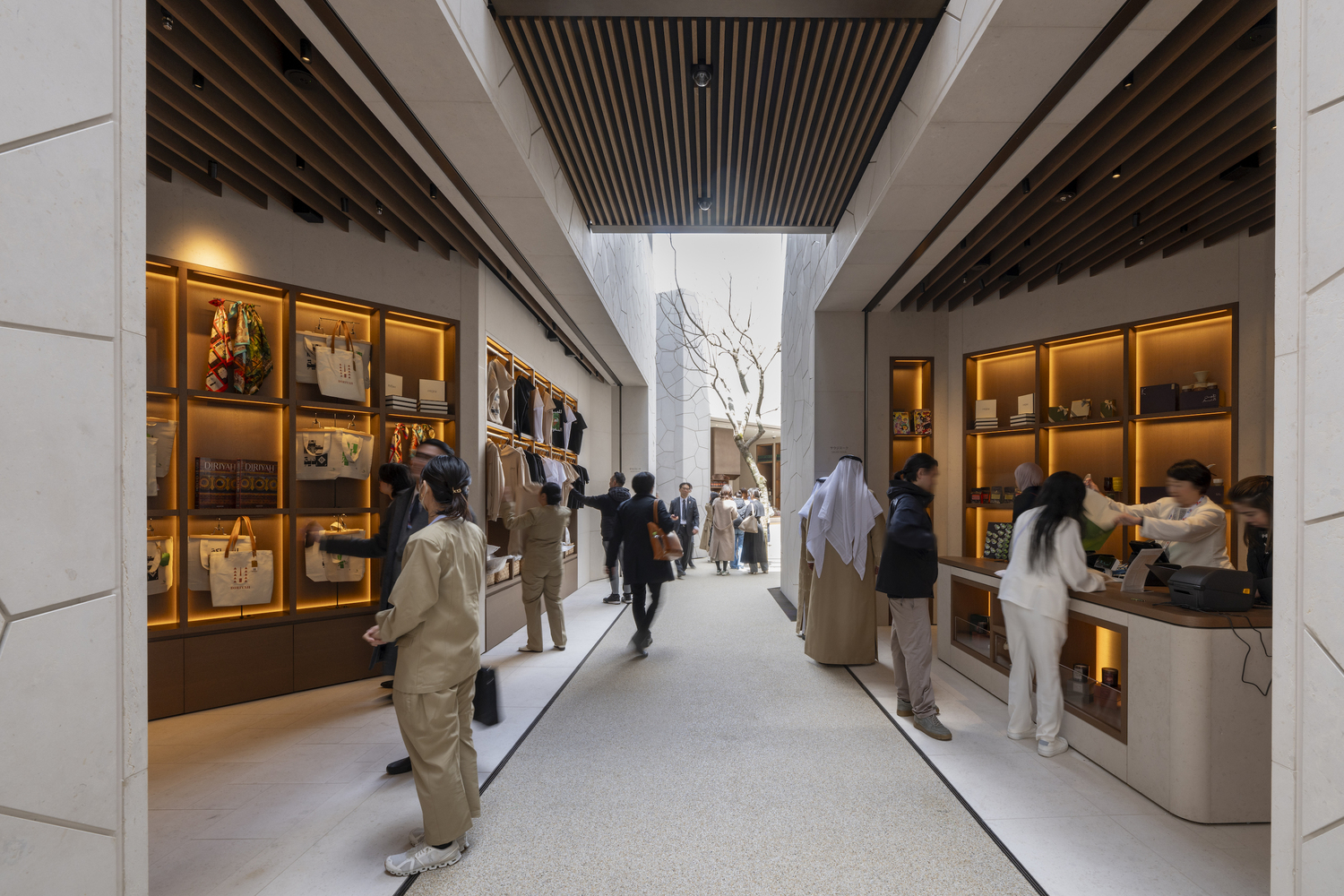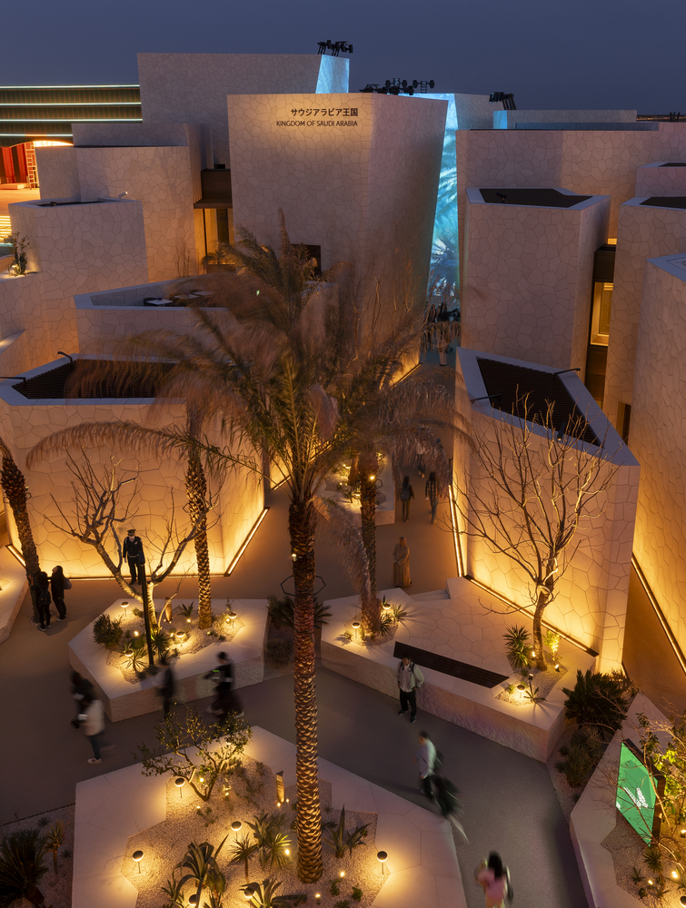 Visitors are greeted by a forecourt planted with flora native to Saudi Arabia, setting the tone for the experience inside. From there, they move through a network of narrow streets that lead to the heart of the Pavilion: the Saudi Courtyard. This central space serves as a quiet retreat during the day and transforms into a lively venue for cultural performances and events in the evening.