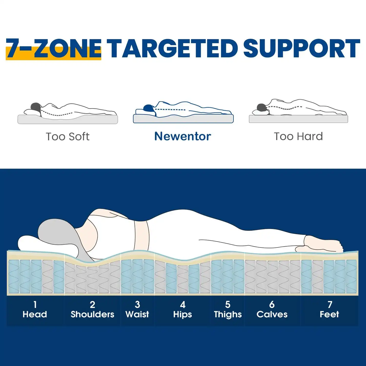 The core benefit of the Newentor hybrid lies in its 7-zoned pocket spring support system. Traditional innerspring mattresses use one type of coil across the entire surface. Modern hybrids, however, utilize pocketed coils—each wrapped individually—that allow for precise, isolated movement.