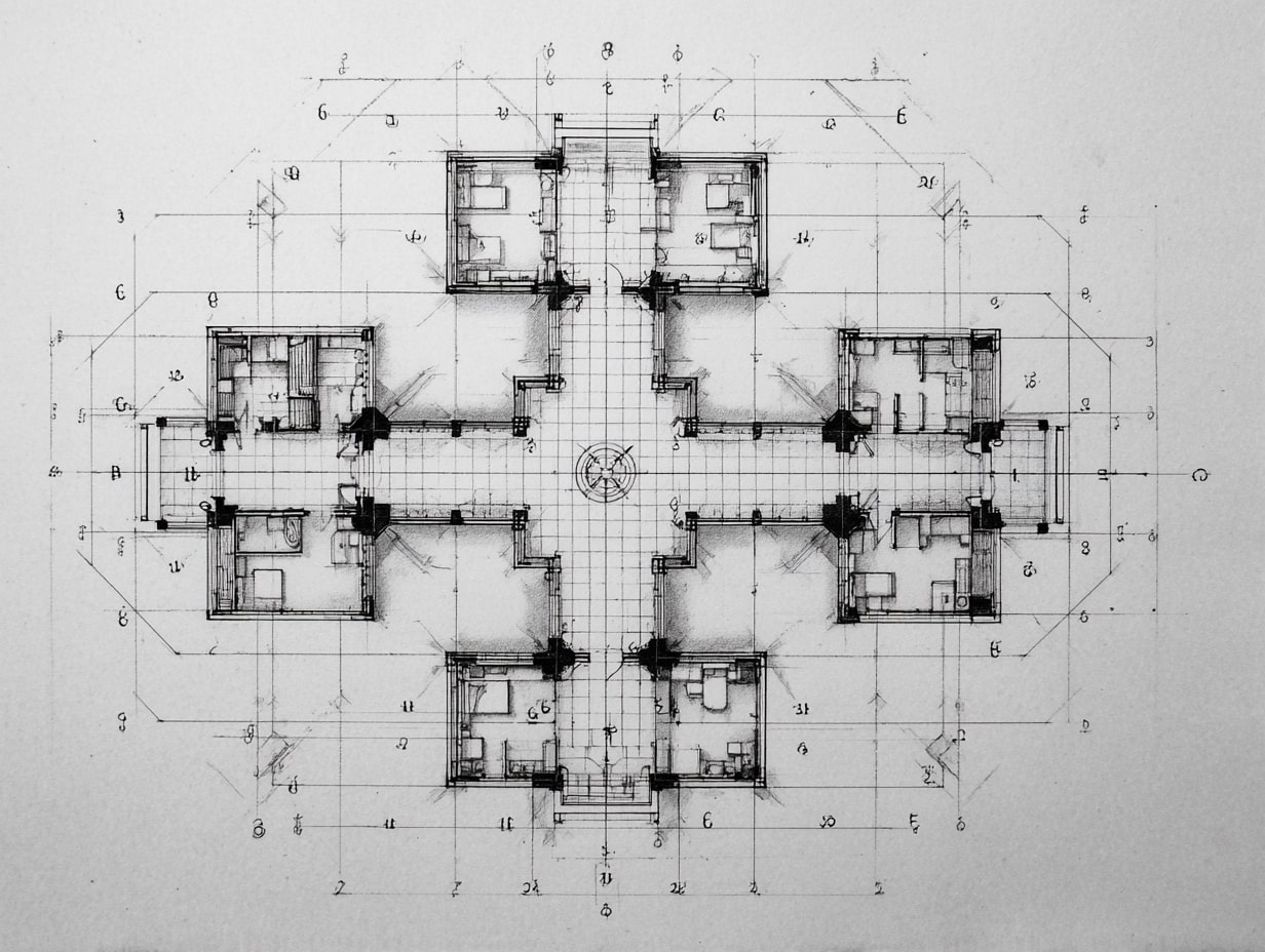 Grid lines (A, B, C… and 1, 2, 3…) anchor layout. We set out columns, walls, and shafts by grid intersections and verify with survey control points and benchmarks. On site, control is king, tie layout to the benchmark elevation and the project coordinate system before pulling tapes.