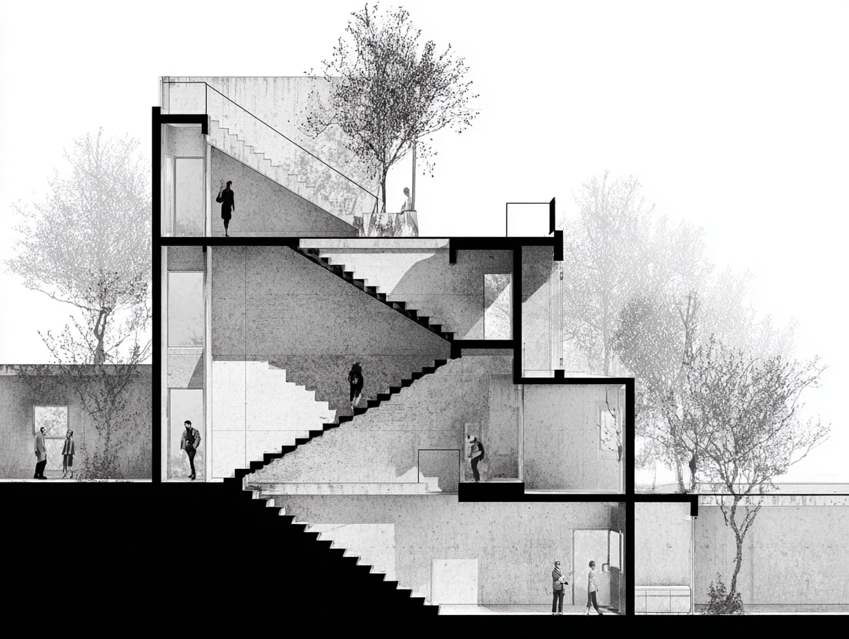 - Longitudinal sections run along the long axis of a building, capturing sequences of spaces, great for public buildings, schools, or transit hubs where procession matters.
