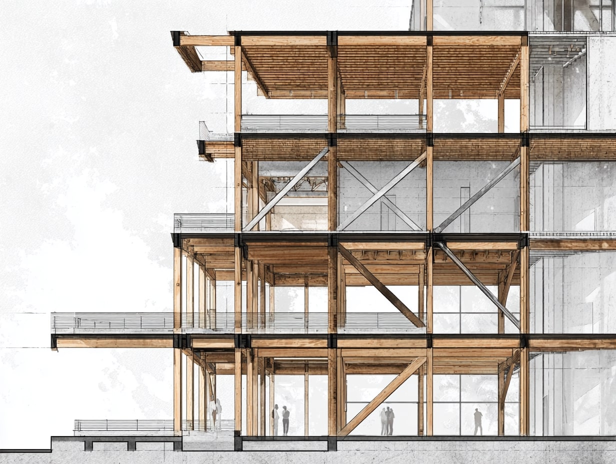 - Cross sections cut across the short axis, ideal for showing structural spans, floor-to-floor heights, and façade-depth strategies.