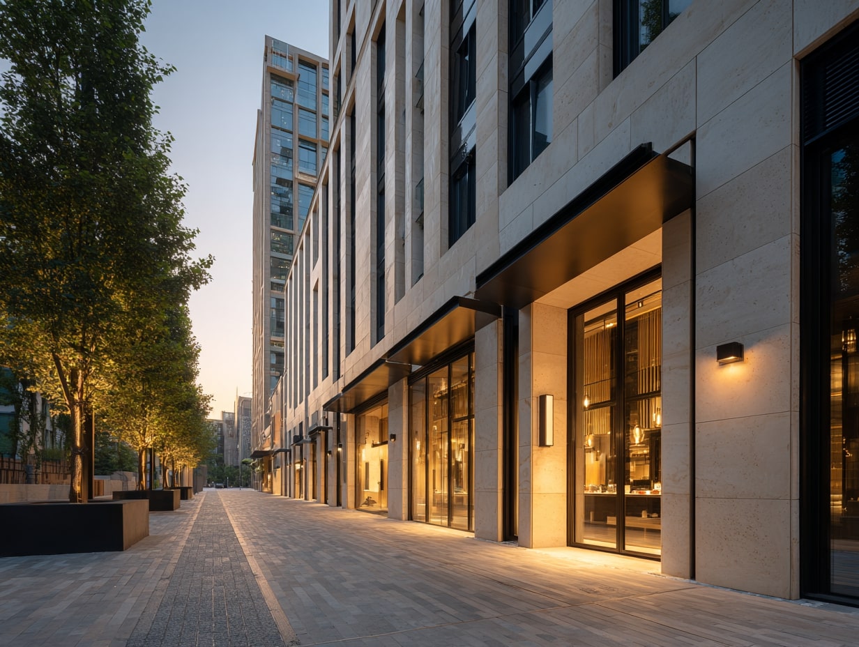 Facade scale governs comfort and performance. Window-to-wall ratio, mullion spacing, and exterior shading must align with orientation and climate. Finer-grained facades with vertical fins or deep horizontal shades can cut cooling loads while preserving views. Daylight apertures tuned to task areas reduce electric lighting and improve well-being, oversized glass without shading does the opposite, driving glare and HVAC demand.