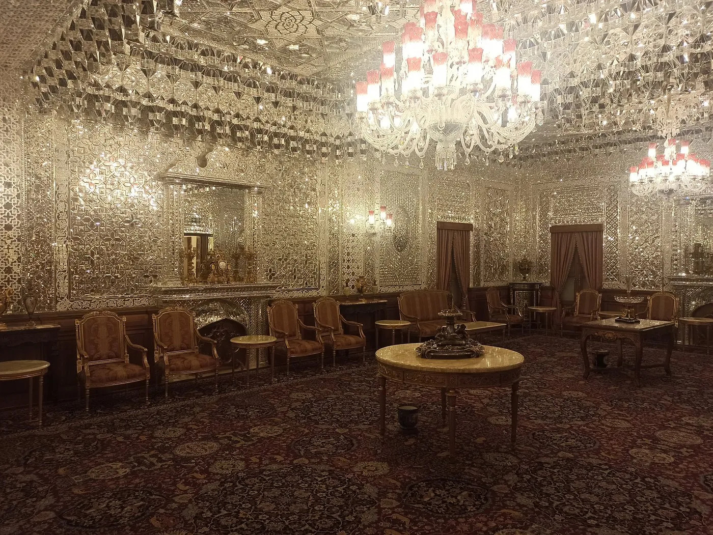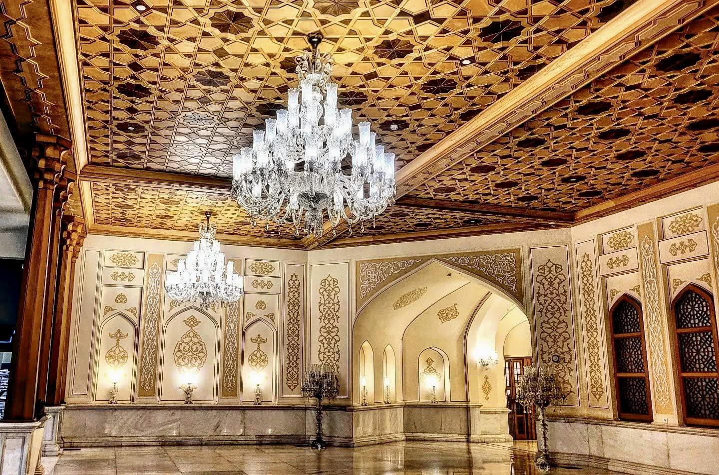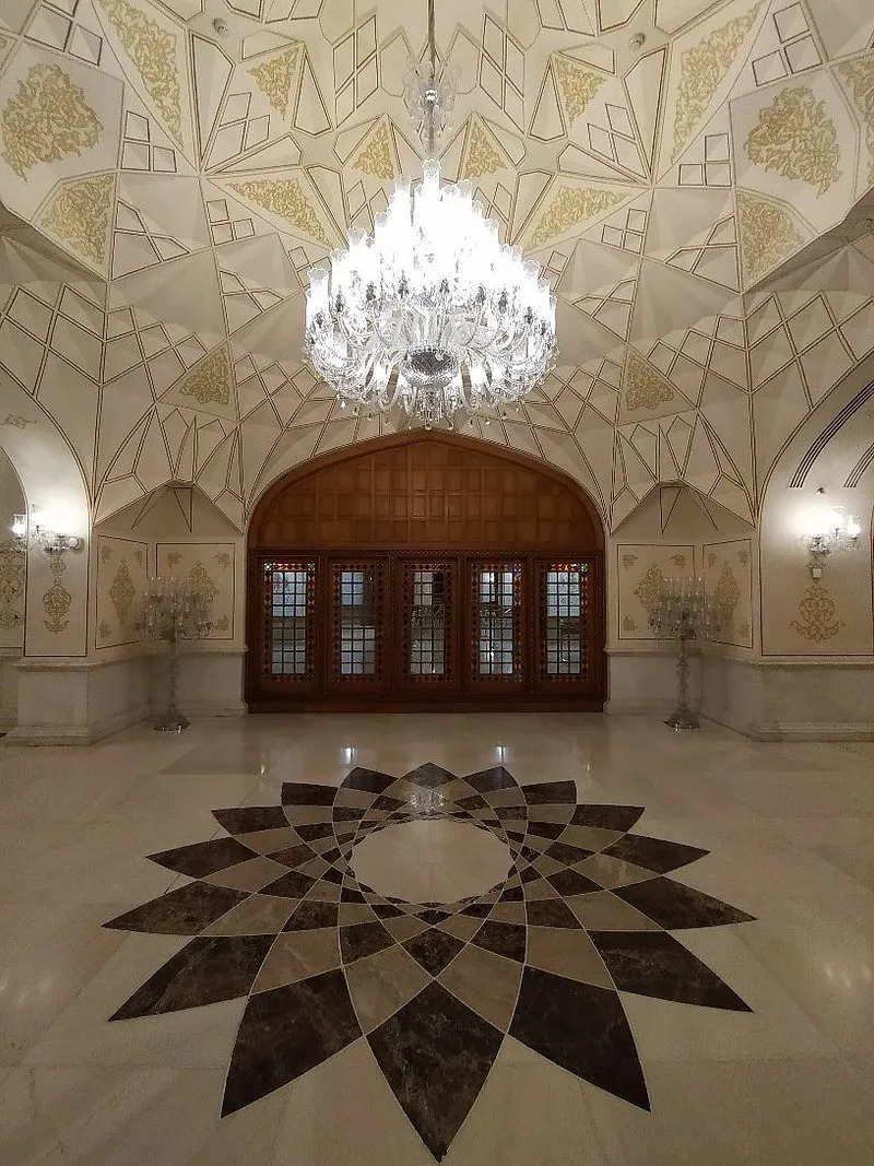 The Mirror Hall represents centuries of Persian-Islamic decorative tradition, where mirrors have served as fundamental elements of architectural ornamentation. Combined with a 126-square-meter Persian carpet that echoes the ceiling motifs, the space creates breathtaking visual harmony between floor and ceiling.