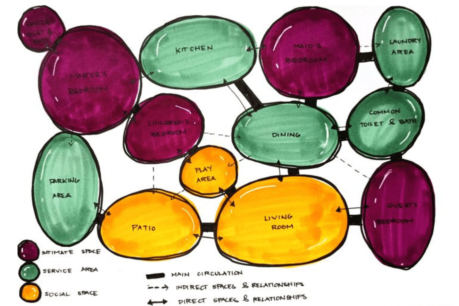 A successful diagram also demonstrates logical adjacencies between spaces, reflecting how users will move and interact within the building. When relationships are carefully considered, key functions remain conveniently connected while conflicting or disruptive uses are strategically separated. For example, public and private areas can be distanced, while service zones stay close to operational cores. Capturing these adjacency relationships in the bubble stage prevents circulation bottlenecks, noise conflicts, and programmatic inefficiencies later in the design.
