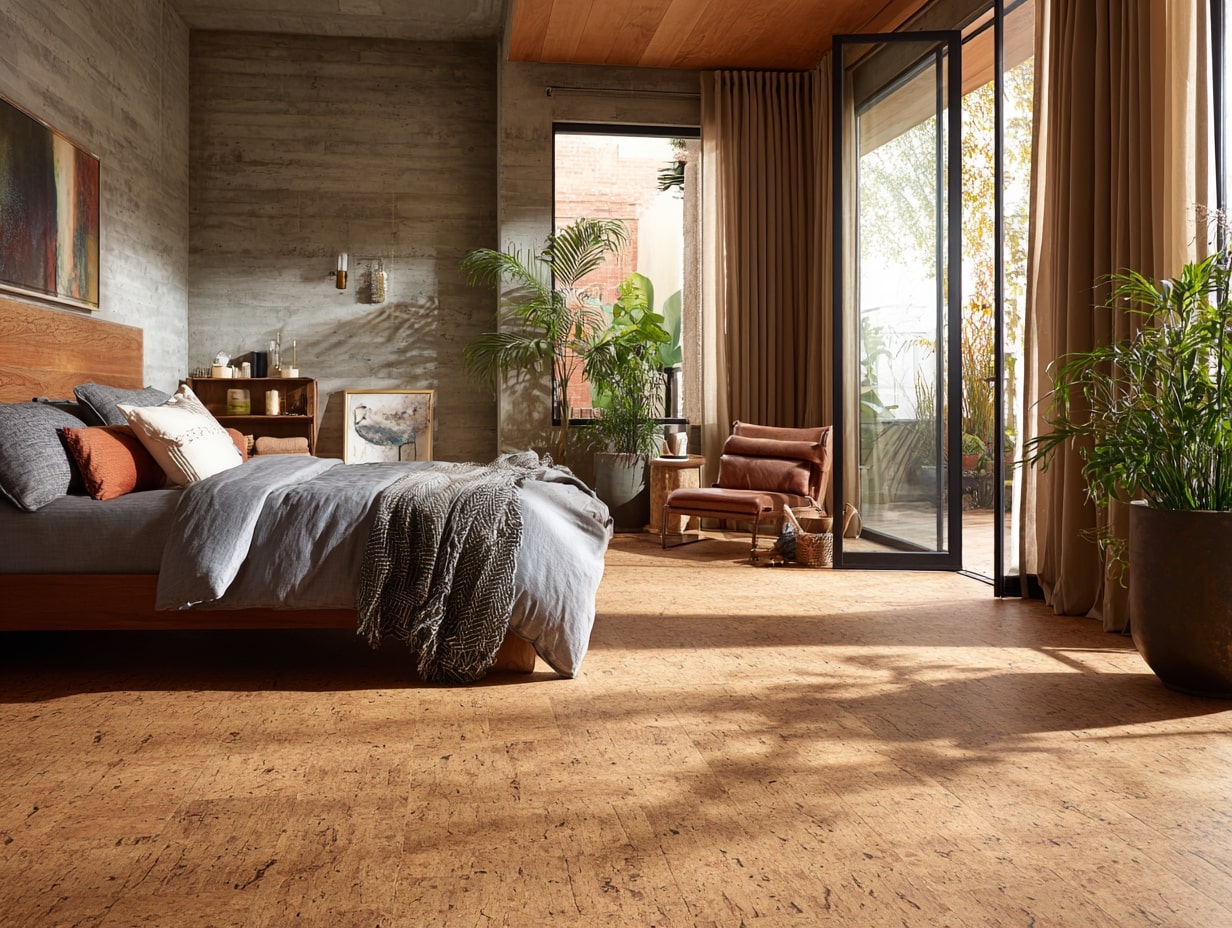 Cork or FSC solid/engineered wood brings warmth and can be refinished. Add a wool area rug with natural rubber or felt backing. For a soft wall-to-wall feel, choose low-emission wool or recycled-content carpet tiles.