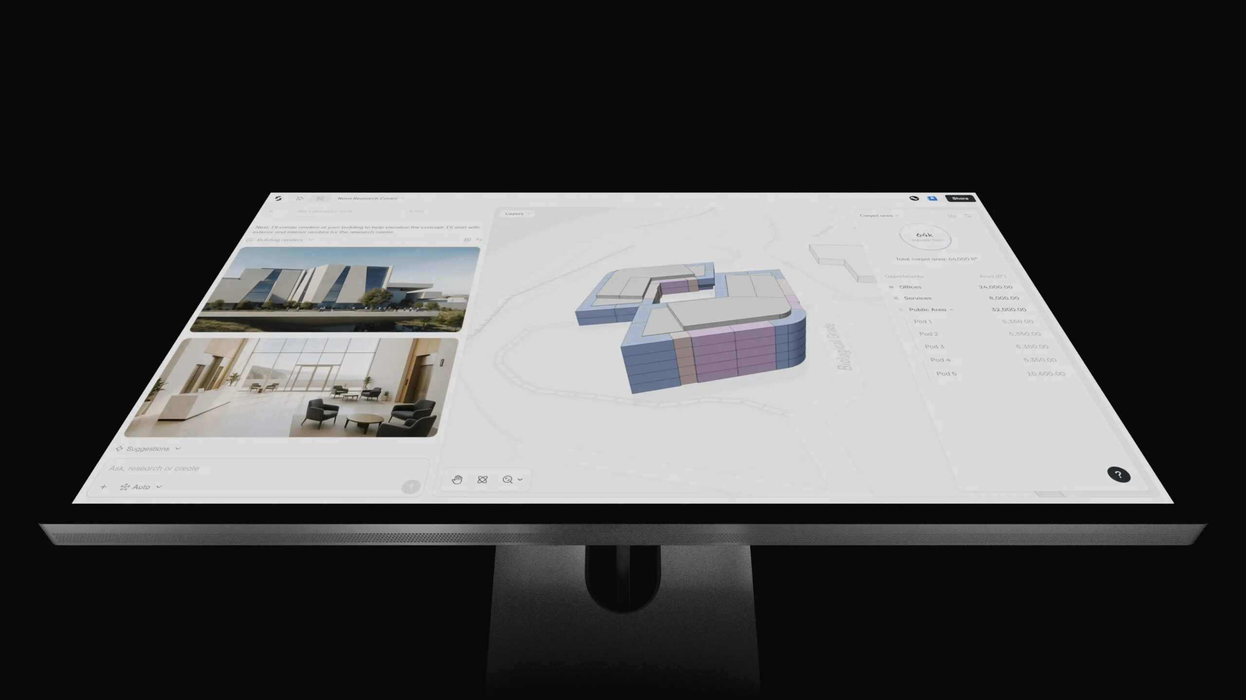 Moving to Design Canvas, the program data drives initial spatial arrangements through AI-powered adjacency packing. The architect manipulates these layouts, pushing and pulling spaces while the system maintains data integrity and provides real-time feedback on area compliance and environmental performance. This approach aligns with the evolving role of AI in modern architectural design.