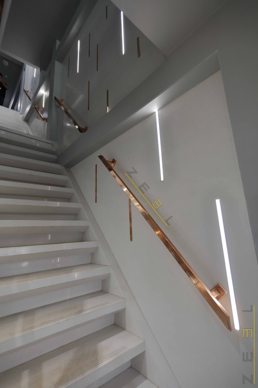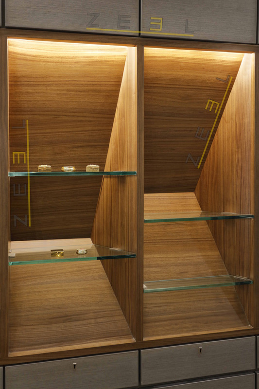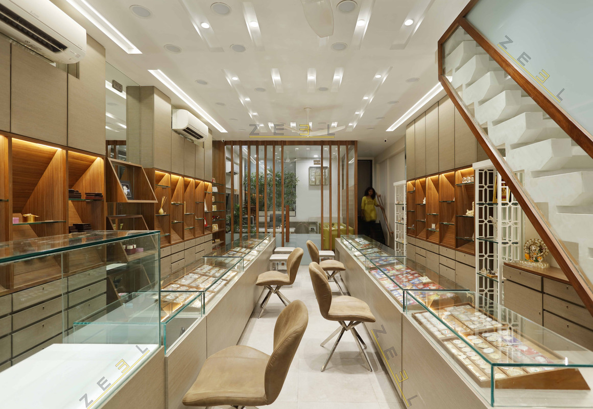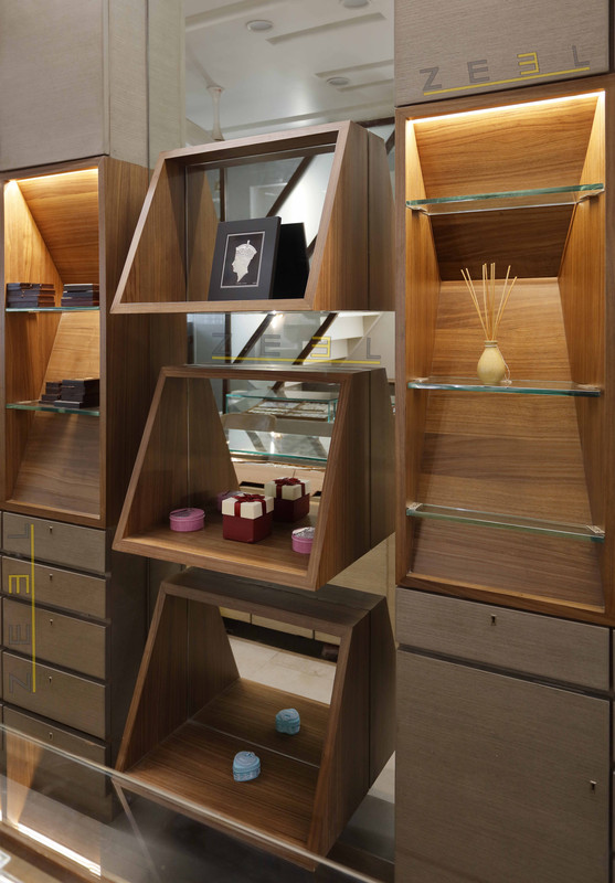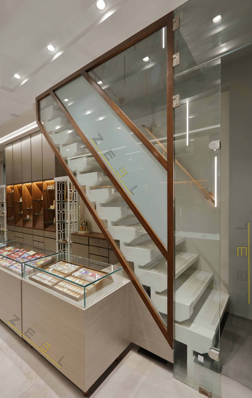 Display is designed in such a way that only jewellery is highlighted over the furniture. Lights were focused particularly on the display only. Wood fins and glass used for the cabin gives partial openness to view the customers. Staircase is made in white stone, with steps cantilevered from the wall.