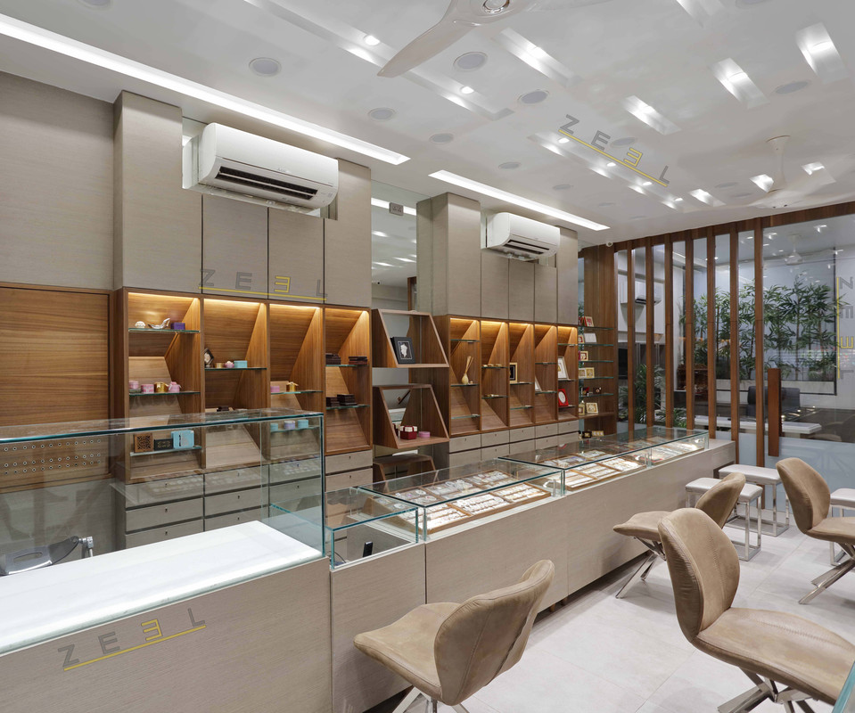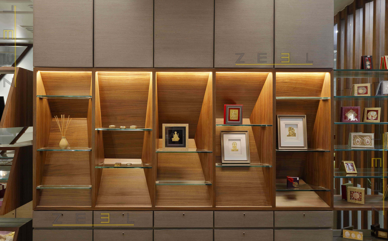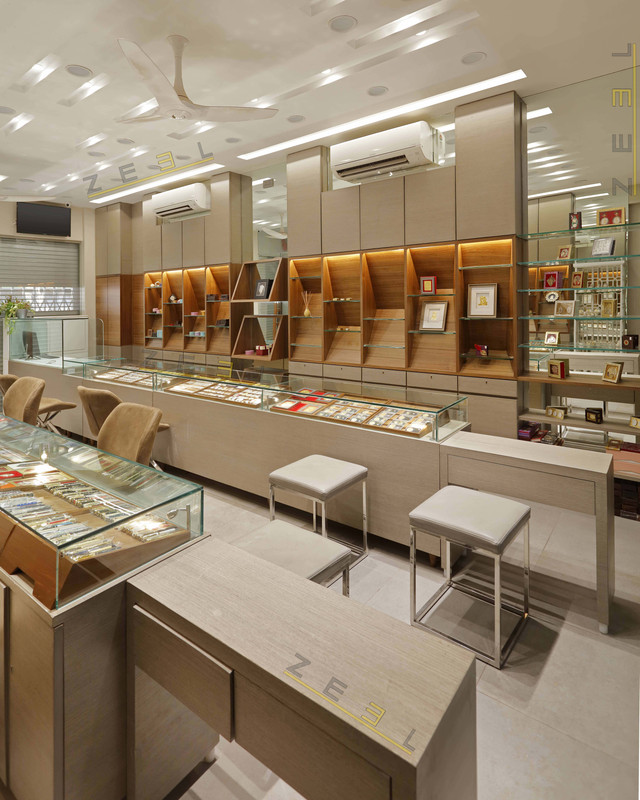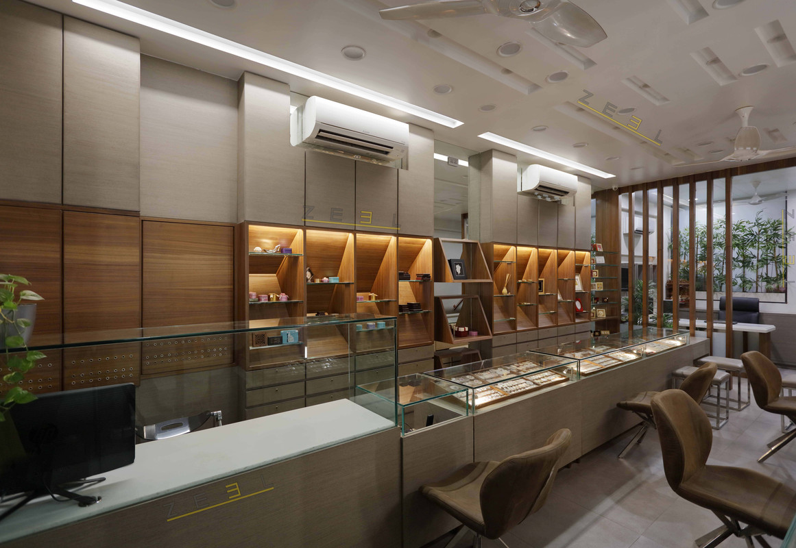 This jewellery showroom is located in one of the busiest markets of jewellery, formerly known as Javeri Bazar/ Dagina Bazar. Two small shops were combined into one to make a bigger showroom. The brief of the client was to make it look different from all the surrounding showrooms (typical jewellery shops).
