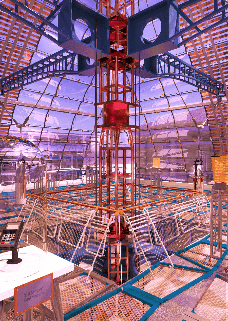 The grandiose reinvention of the shopping mall and a typical British High Street is encapsulated in a skin of shop shutters, protecting spaces such as the Garden of Eat’n and Hall of Forgotten Artifacts. Based in the heart of the town, the shutters provide opportunities for light, protection against the elements as well as inducing a sense of mystery and wonder. At the end of each day, the entire building takes part in the Grand Shutter Ceremony where the sound of metallic shutters create a forgotten symphony. Fill your trolleys with the buried culture of shopping.