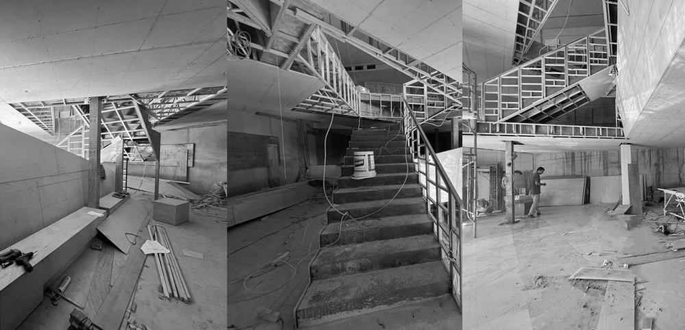 During construction, the concrete structural beams were naturally exposed, resulting in an unintentional yet striking design feature. The triangular relationships within the space naturally form diagonals and slanted surfaces, completing the spatial composition through the flow of people.