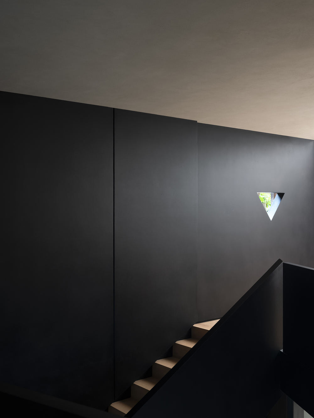 Throughout this visiting circulation, an exploratory experience is created. The inverted triangular opening of the mezzanine cleverly introduces the view of outdoor trees into the space, offering a unique visual experience. On the first floor, the visual experience highlights spatial infinity, while the mezzanine provides a perspective that connects the first and second floors, showcasing their contrasting yet integrated relationship. The staircase to the second floor, although linking the mezzanine and the second floor, visually centers on the first floor, providing an unexpected visual delight.