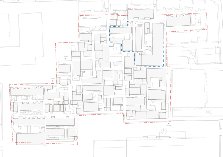 In the north of the site stands a three-storey apartment block from the 1970s. On the east lies a large factory building with only the purlins remaining at the top, and an ancillary dormitory building opposite it. Between them, a small two-storey building stands to the north, while the factory building extends parallel from the south, together enclosing a courtyard littered with debris, including a buried staircase leading to the factory building’s second floor.