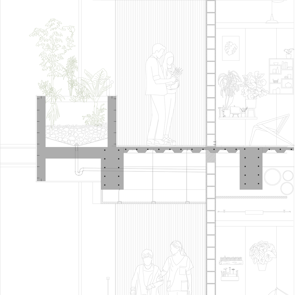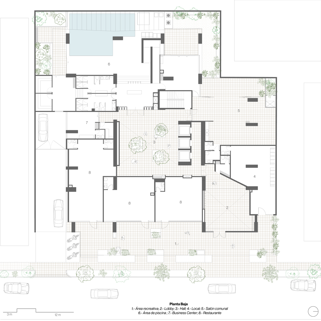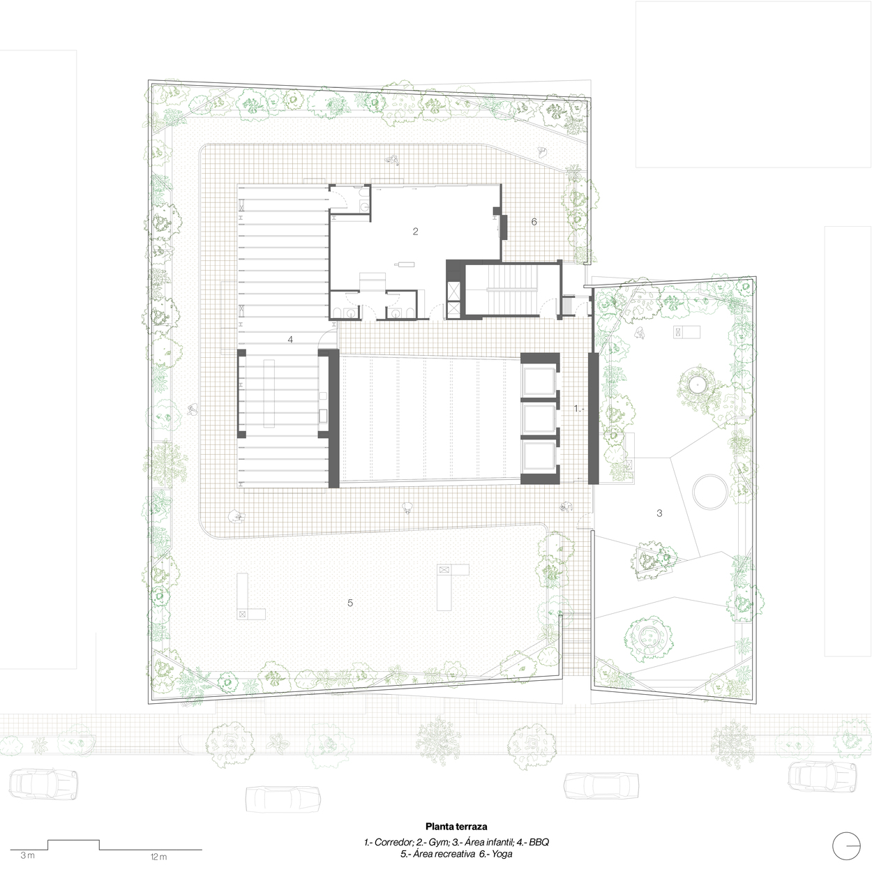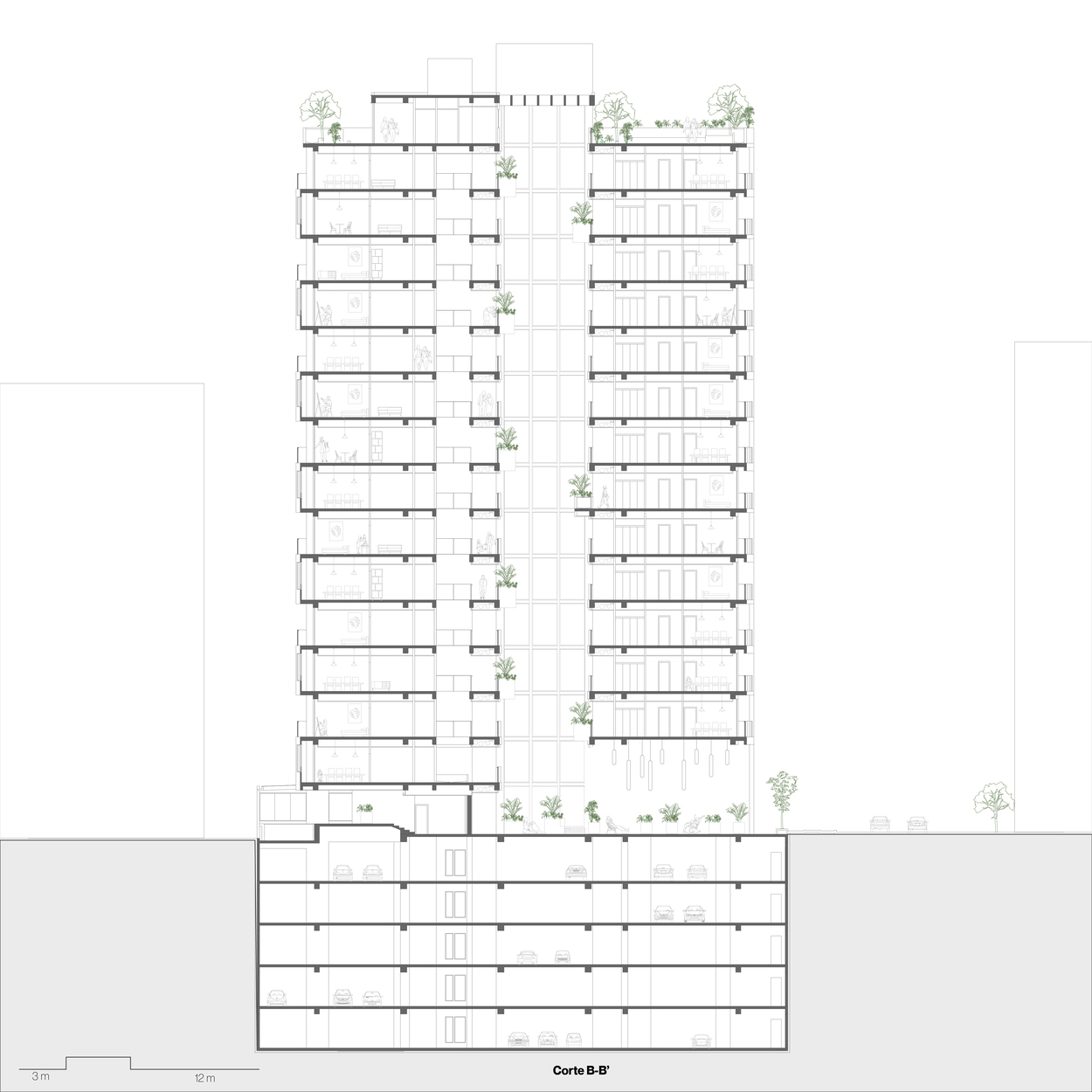 In response to new eco-efficiency regulations, the building adopts sustainable strategies that are uncommon in the real estate sector. A prominent feature is the central atrium, which facilitates natural ventilation and lighting while housing hanging planters with randomly placed trees, reinforcing the presence of nature throughout the project—from the public plaza to the interior corridors and private rooftop garden.