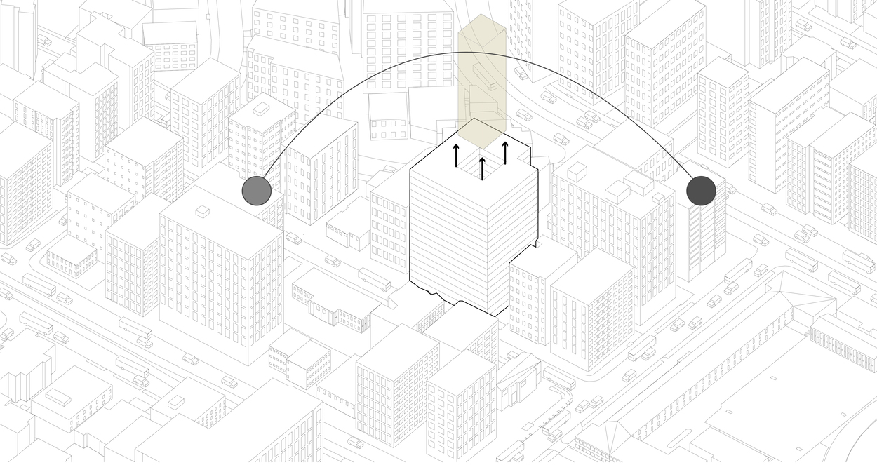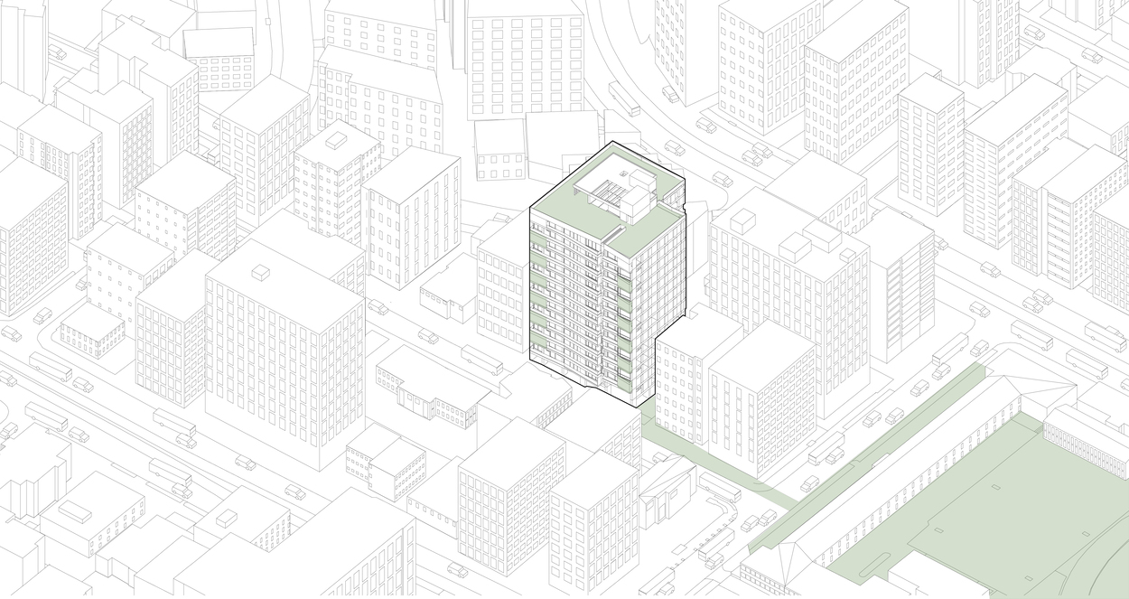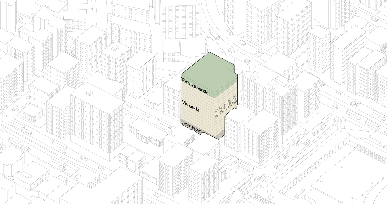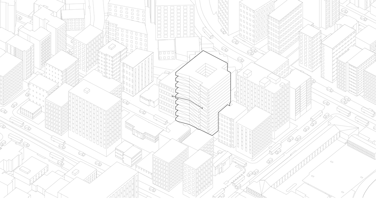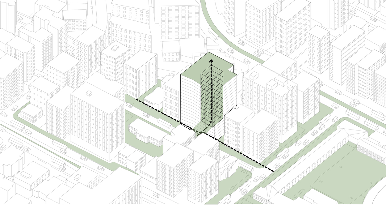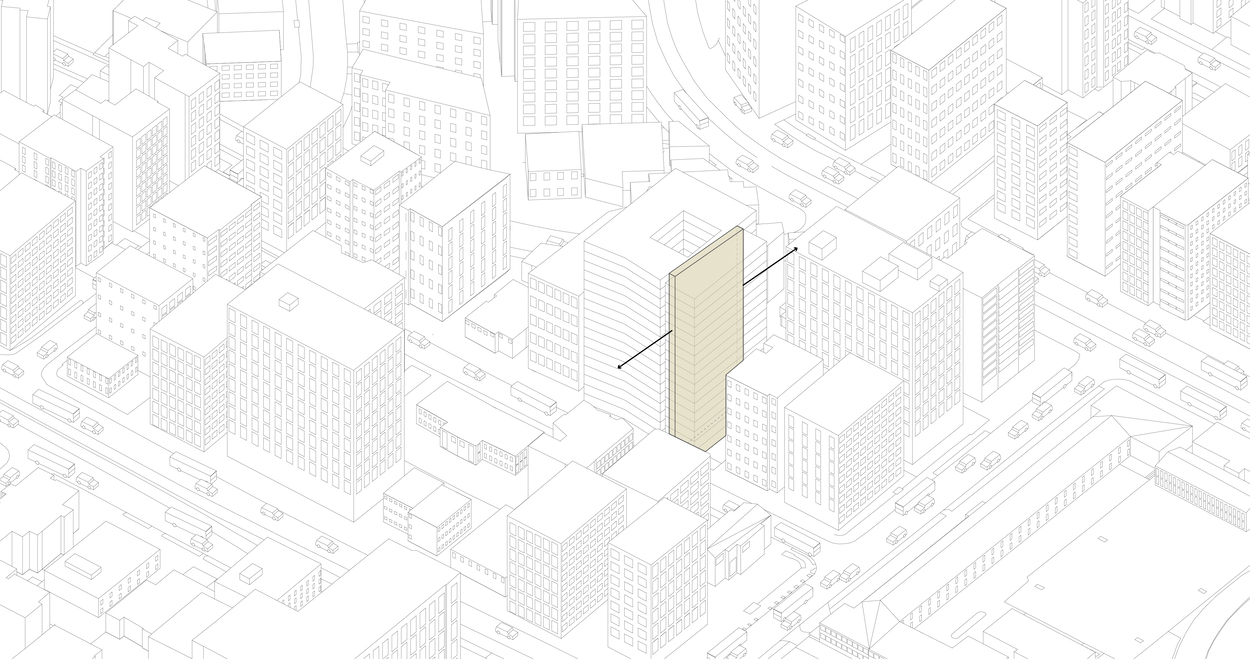 The architectural proposal focuses on leveraging the newly permitted high-density zoning in the city. Situated on a wide-fronted site, the building is divided into two structures to reduce its mass and establish a better relationship with the neighboring buildings.