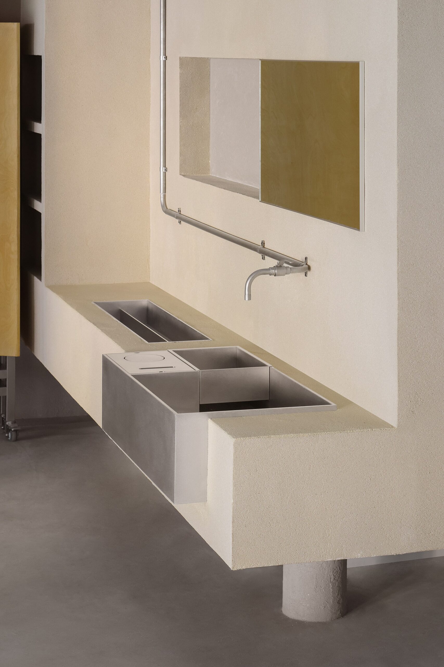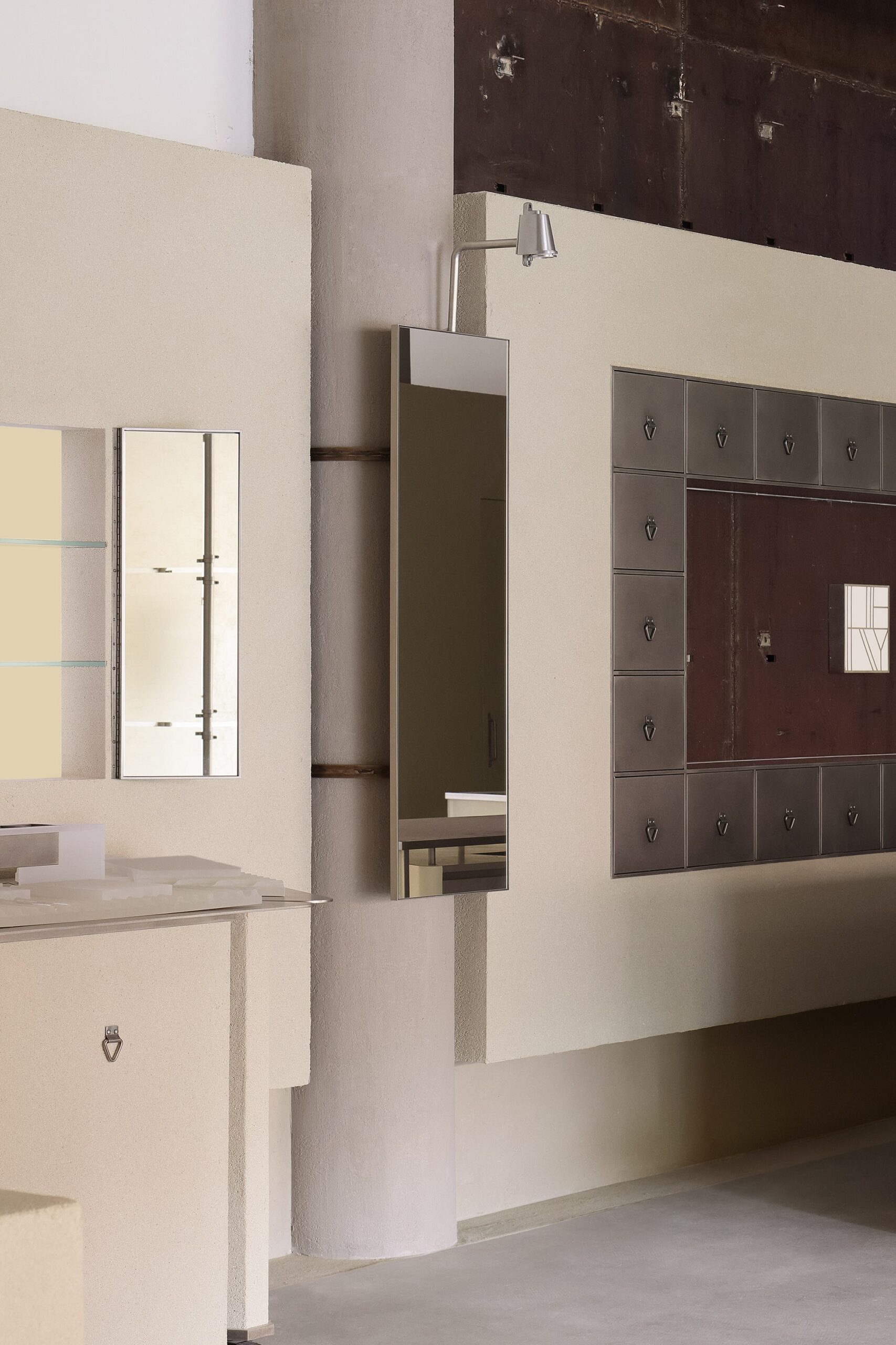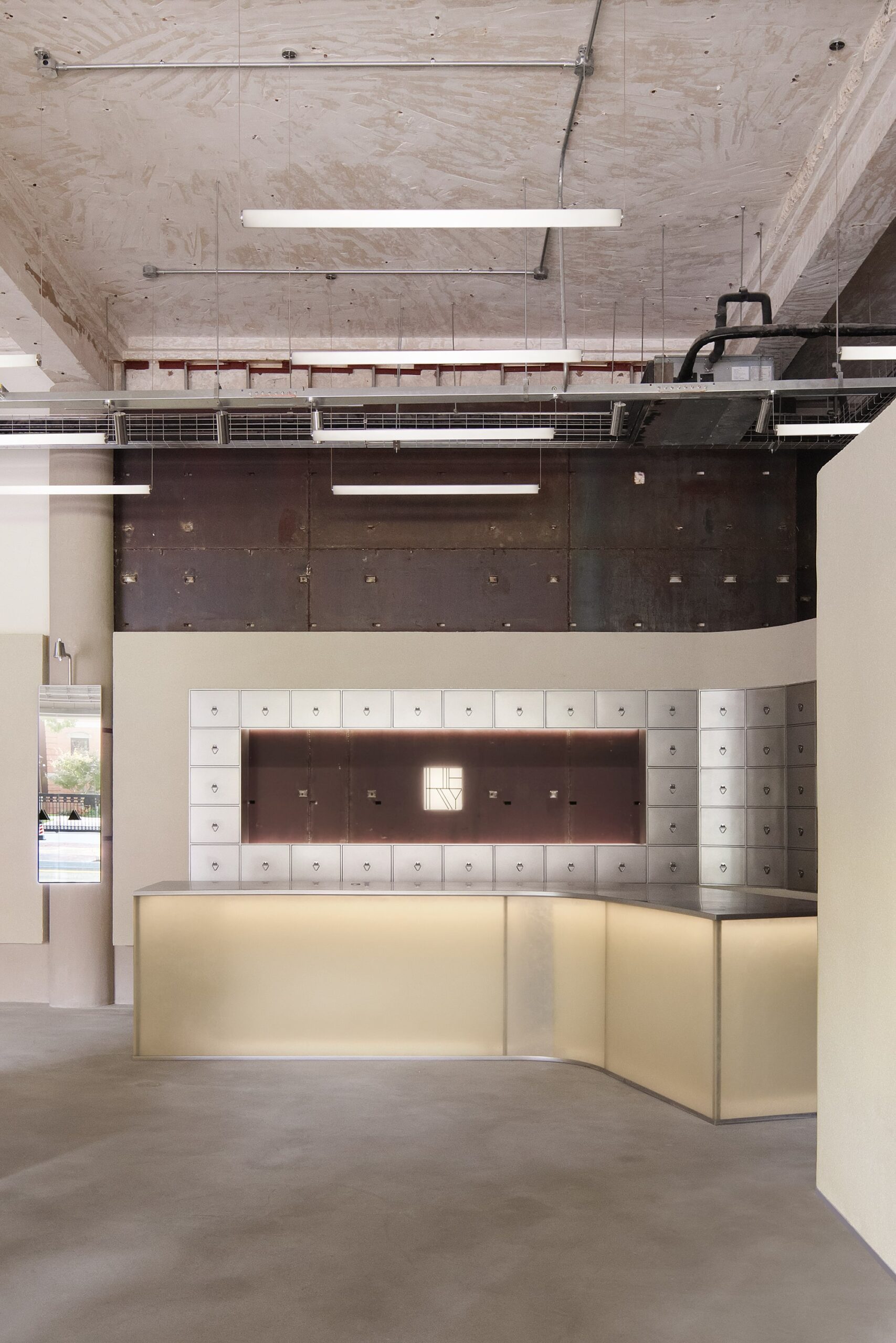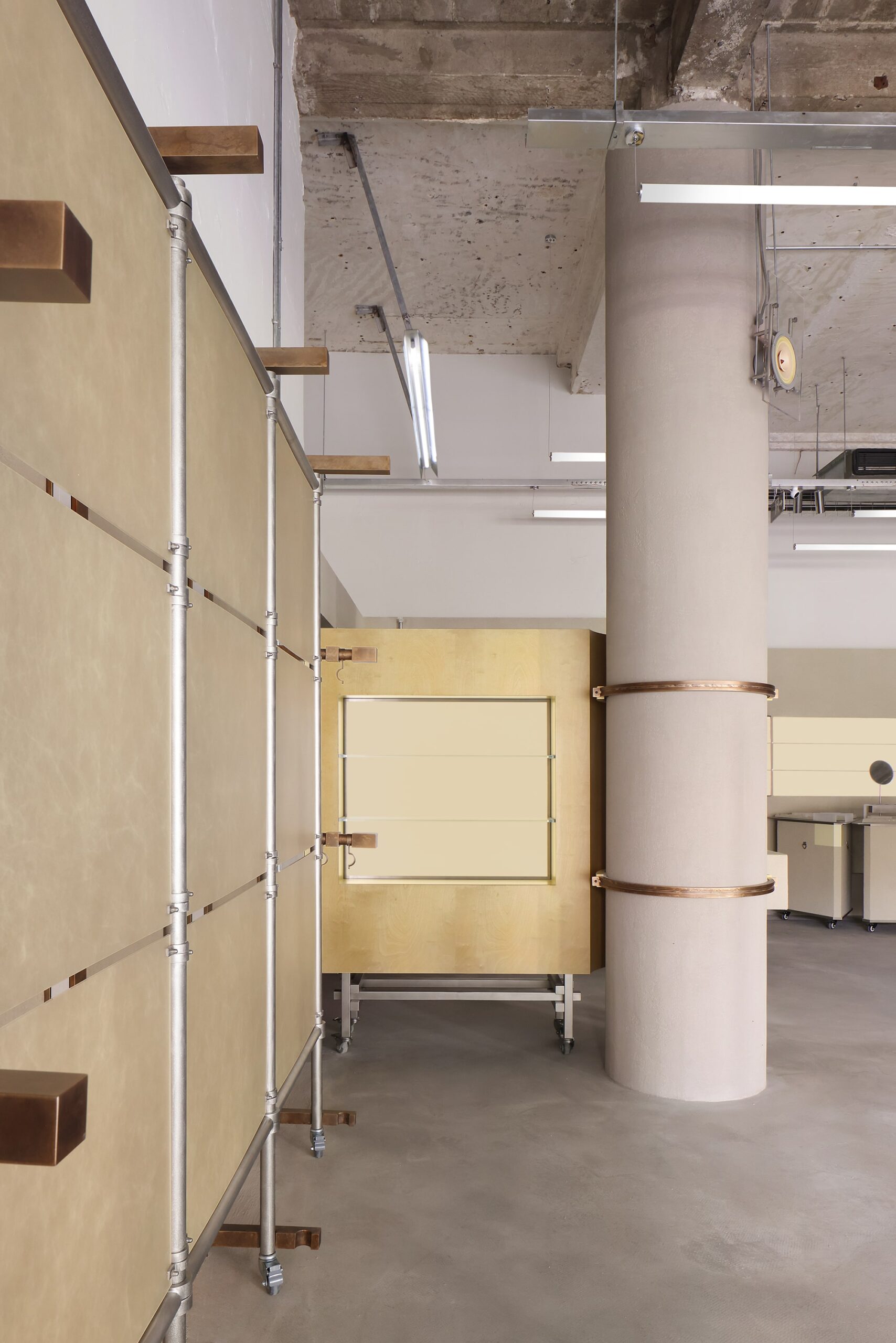 With an original ceiling height of 4.3 meters, a 2.6-meter-high low wall system was added along the perimeter. Horizontal metal frames were used to create a visual buffer, softening the space’s vertical austerity while leaving a distinct mark of contemporary design. As one’s gaze passes through the new metal grid, the carefully preserved rusted steel walls emerge—transformed from original dry-hanging components into decorative yet functional interfaces. These elements serve as historical slices of the spatial narrative and naturally divide the experiential flow.