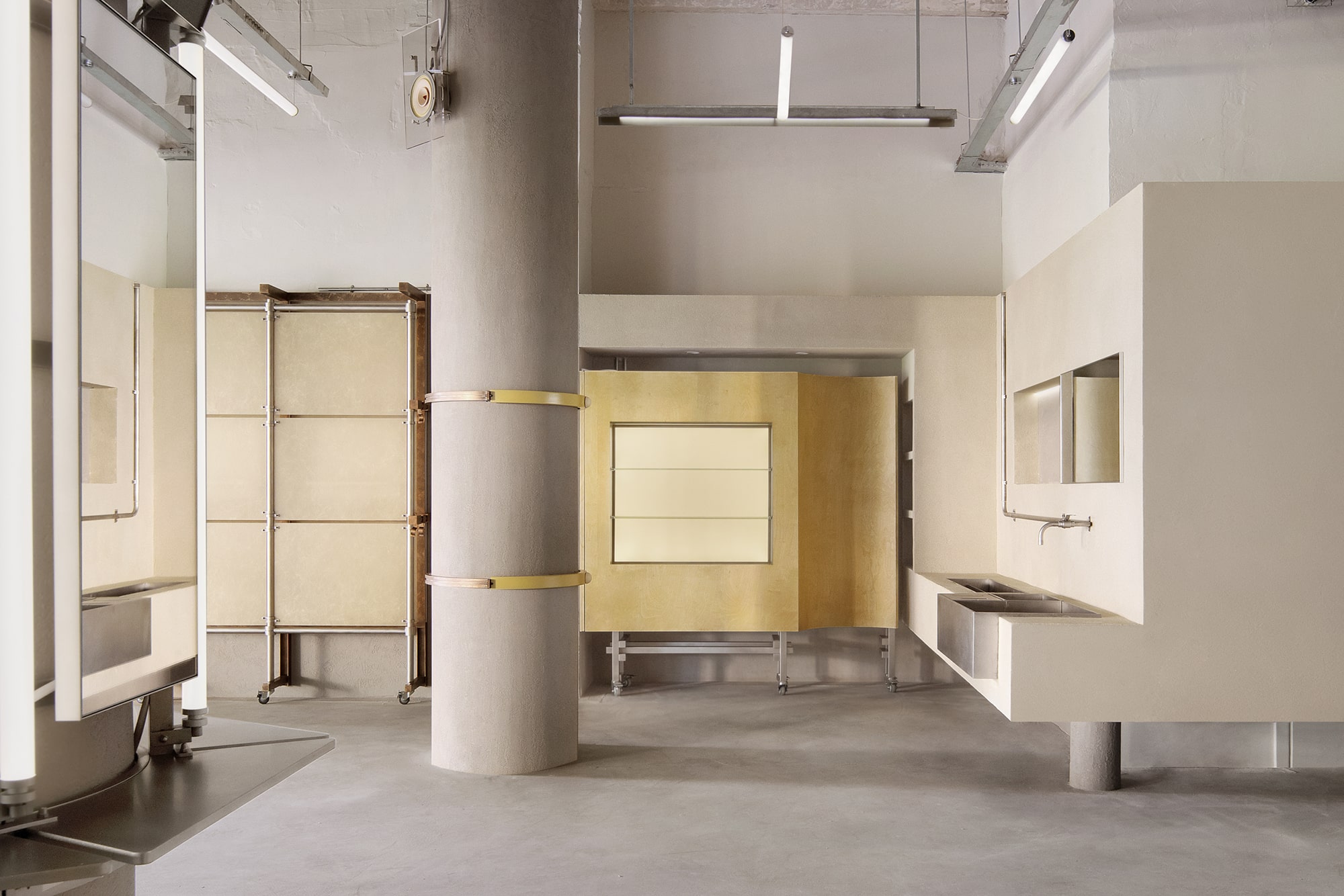 At the entrance, a lighthouse-inspired installation made of yellow translucent resin serves as a visual anchor for brand identity. Surrounding the “lighthouse,” three sets of metal display racks showcase beauty products. For special exhibitions, resin panel screens can be unfolded and fixed to the wall’s metal structure, providing a flat display surface.