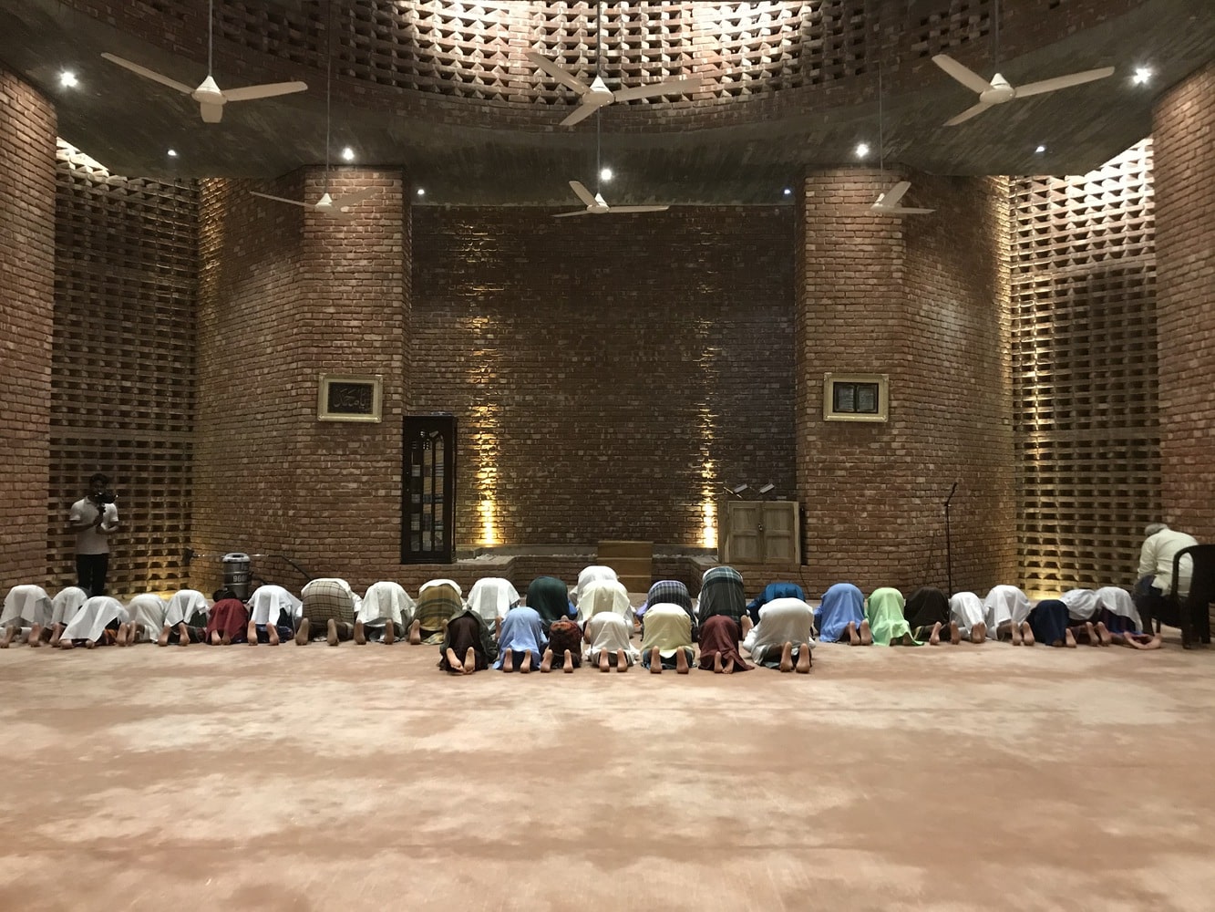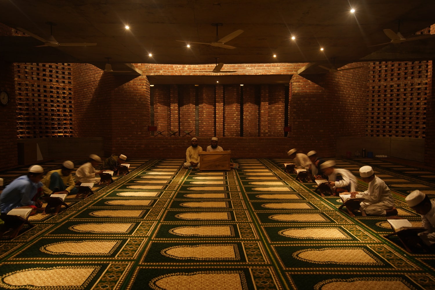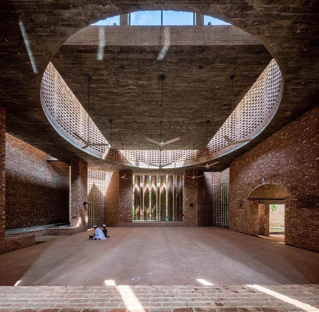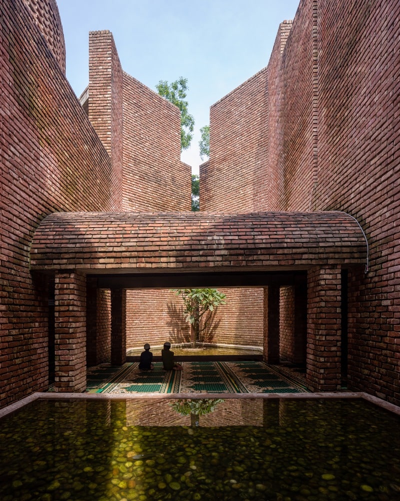 In harmony with the tropical climate, the mosque employs passive design strategies rather than mechanical systems. Traditional windows are replaced by intricately perforated brick jali screens and vertical fins that admit filtered light and airflow. This creates a delicate choreography of light and shadow, gently animating the prayer halls throughout the day.