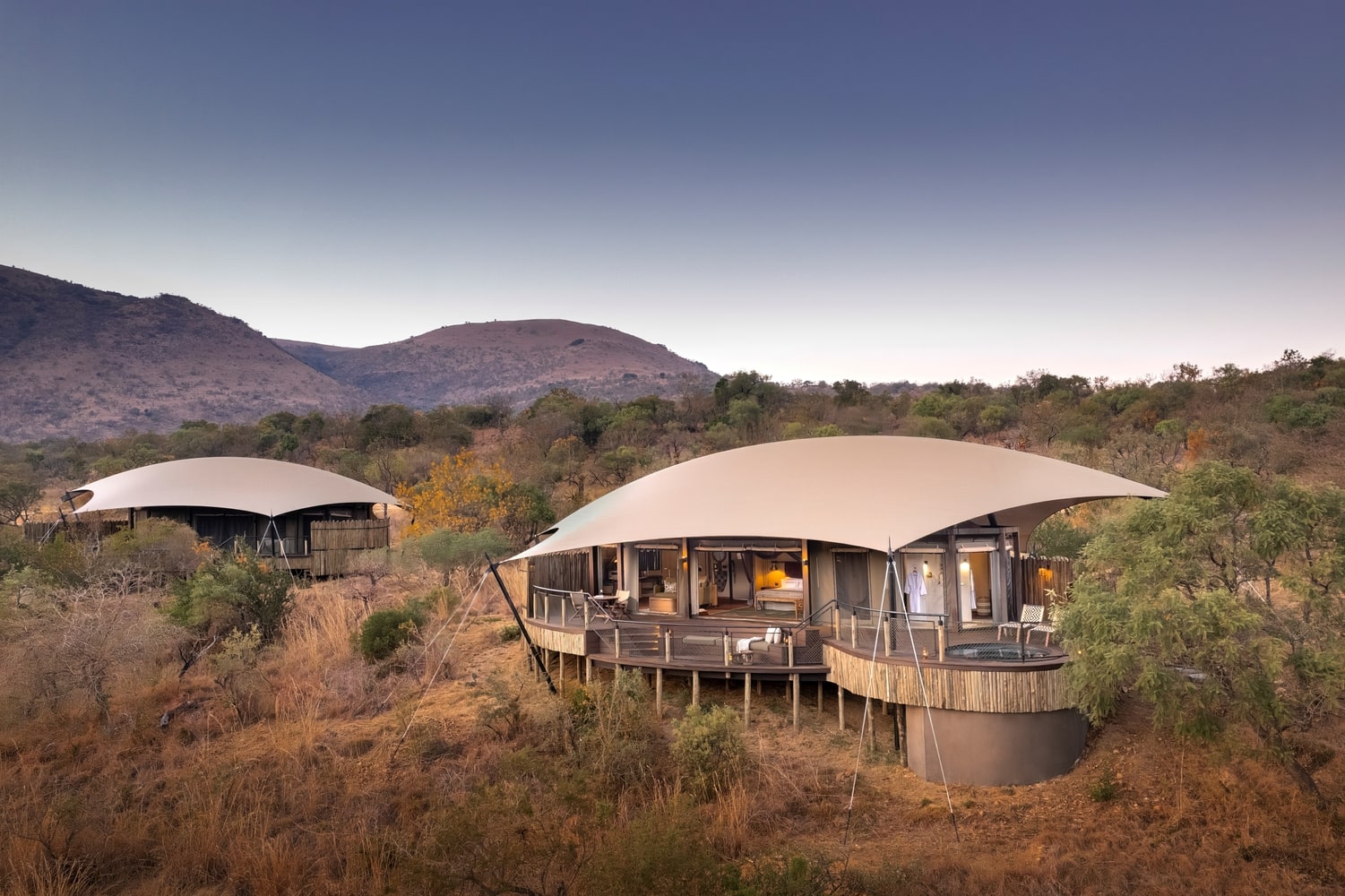 Architecturally, the units draw inspiration from the Zulu shield, with a defining 22-meter curved timber beam forming the structural backbone. This beam supports a tensile stretch-fabric membrane roof, creating a dynamic yet elegant canopy that merges traditional forms with contemporary methods. Sustainable, locally sourced materials such as upcycled timber poles and bamboo decking underline the eco-conscious ethos of the design, while detailed craftsmanship echoes indigenous African techniques, grounding the project in its cultural context.