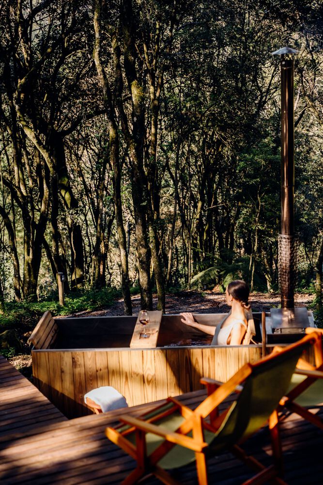 Given the region’s cold climate for most of the year, fire is central to the experience. This is expressed through a wood-burning heater inside, a fire pit, a barbecue grill, and a wood-heated hot tub. Additionally, a dry sauna is integrated into the landscape, offering a complementary outdoor experience that deepens the connection between the guests and the natural surroundings.