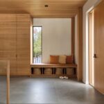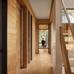 Material selection throughout the interior emphasizes warmth, tactility, and longevity. Floors are finished in brush-finished oak, while a continuous ceiling of western hemlock boards runs overhead, softening acoustics and enriching the sensory quality of the space. This timber ceiling extends seamlessly from interior to exterior, reinforcing continuity between architecture and landscape.