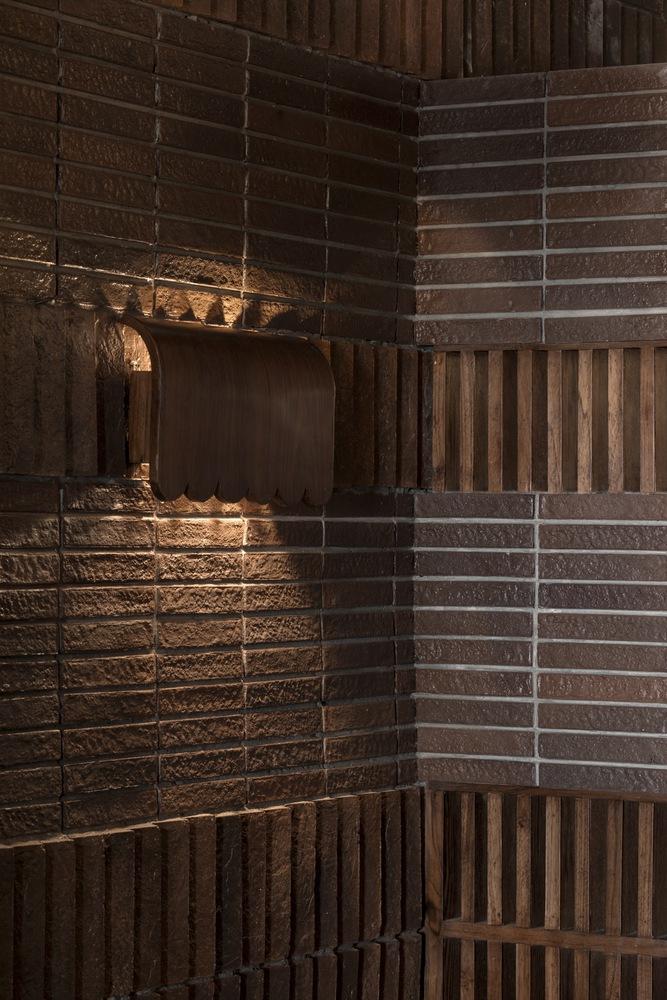 Transitioning towards the curvilinear bar, the space evolves into a dynamic and lively area. The private dining space is defined by wooden slats, planters, and abstract ceiling fixtures, creating an intimate and secluded environment. The central seating area showcases an artistic use of brick laid out in various styles and patterns, adding texture and visual interest to the space.