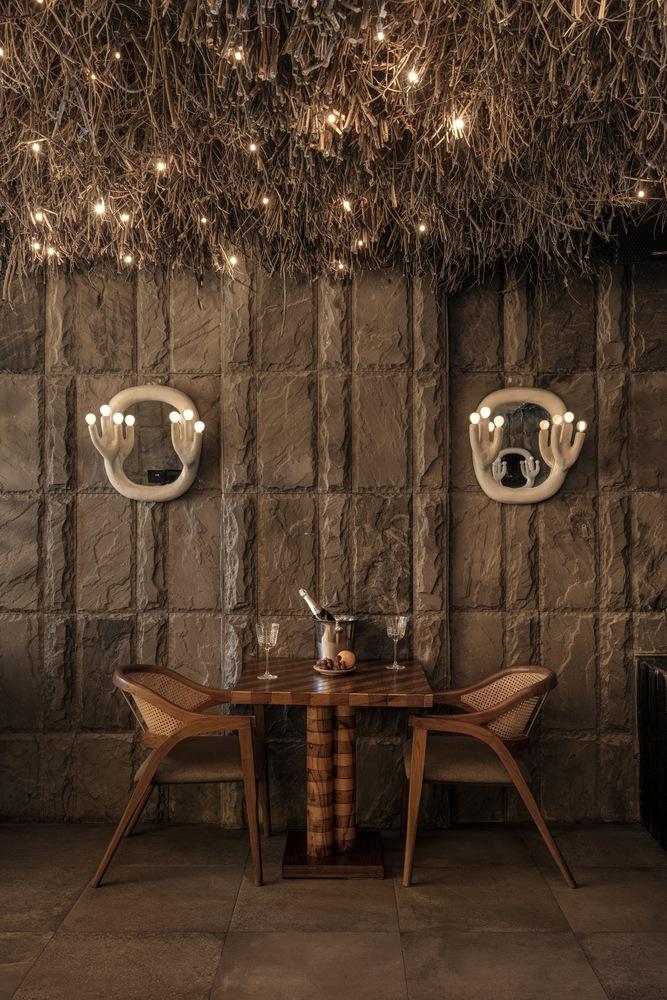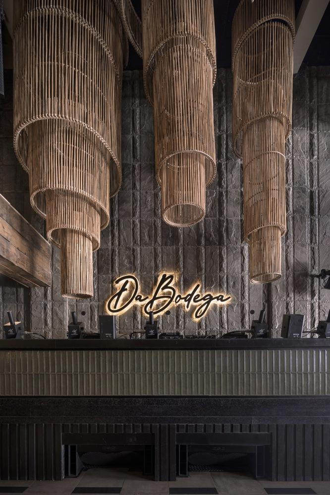 The spatial organization of Bodega is meticulously planned, divided primarily into three distinct zones: the bar area on the left, the central double-height floor, and the private dining area on the right. Each zone has its unique character and ambiance. The bar area features an undulating ceiling crafted from twigs, straw, and thatch, interspersed with miniature incandescent bulbs. This creates an otherworldly atmosphere, setting a stark and captivating mood.