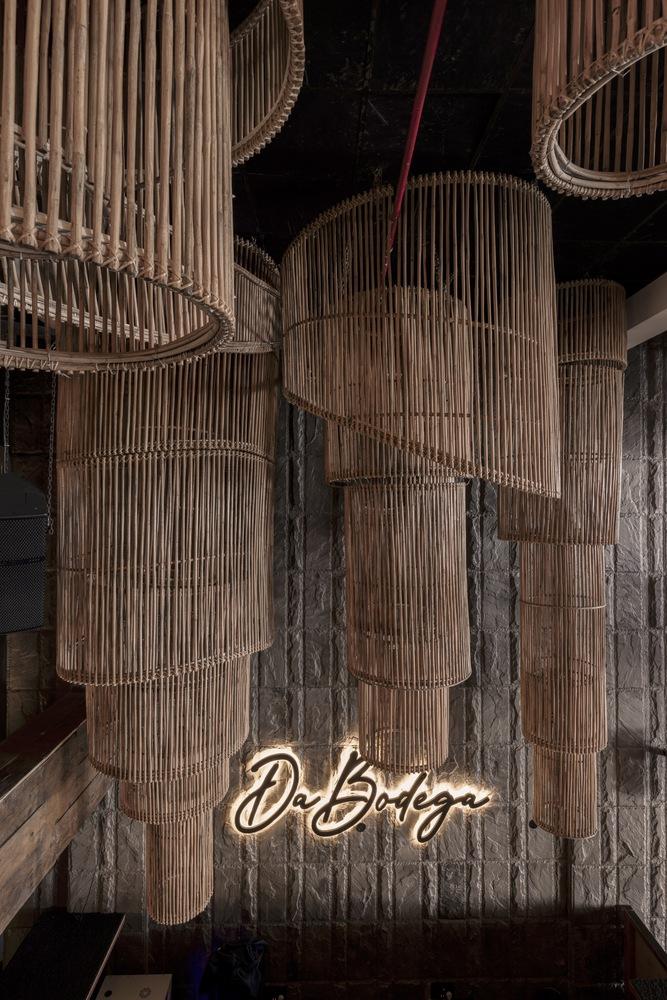 The central feature of Bodega is its awe-inspiring double-height atrium, crowned by a parametric bamboo lighting installation that cascades from the ceiling. This striking feature harnesses the beauty of scale and artfully distorts the perception of the space, transforming the conventional cuboidal shell into a dynamic and visually captivating area. The ceiling installation, conceptualized as a vernacular bamboo chandelier, is not just a functional element but a central piece of art that illuminates and elevates the space.