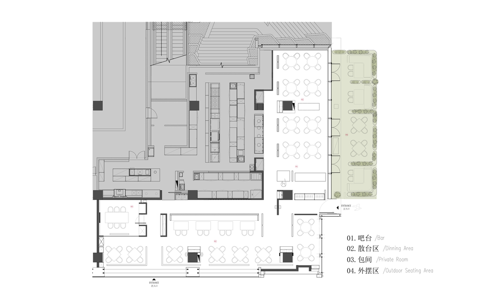 The kitchen efficiently connects with the two main dining areas, enhancing a lively atmosphere. The stragetic placement of the steak cabinet, wine cabinet, and tableware throughout the space optimizes service flow while also showcasing the restaurant’s cultural essence and functionality. Upon entering, guests are enveloped in the culinary culture of the Steak House, bearing witness to the dedication and meticulousness that goes into the preparation of each steak.