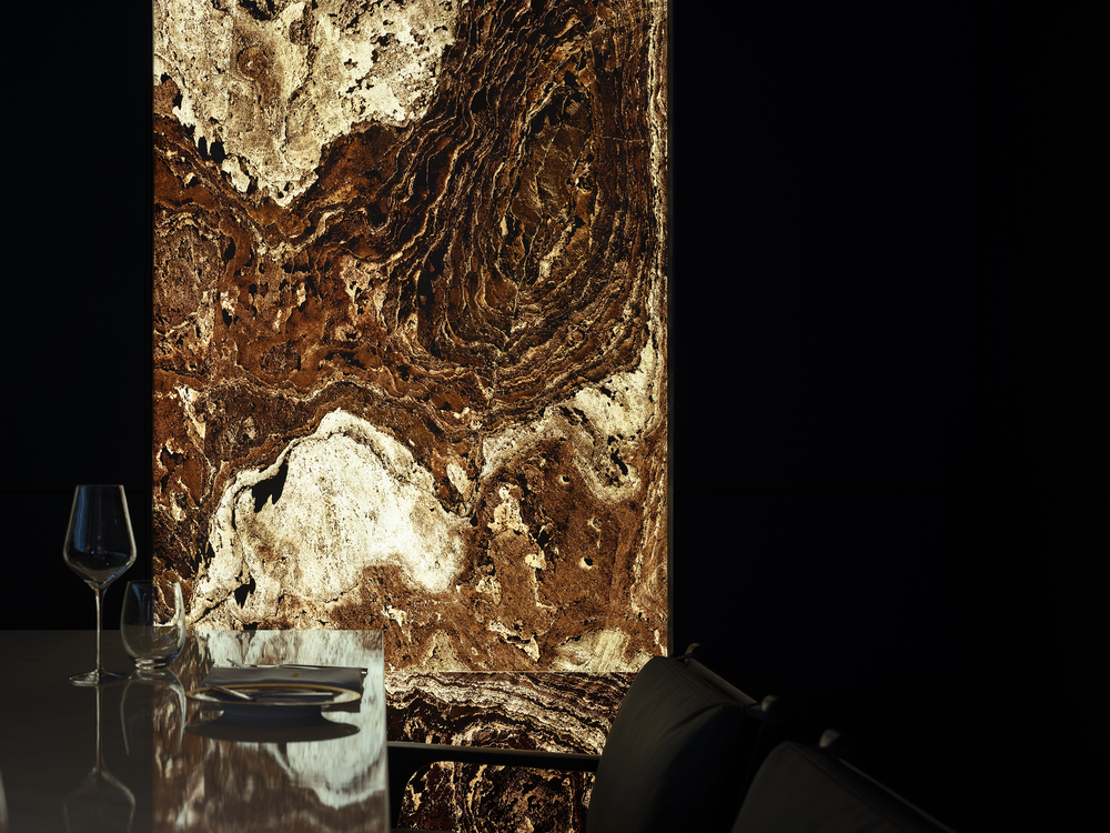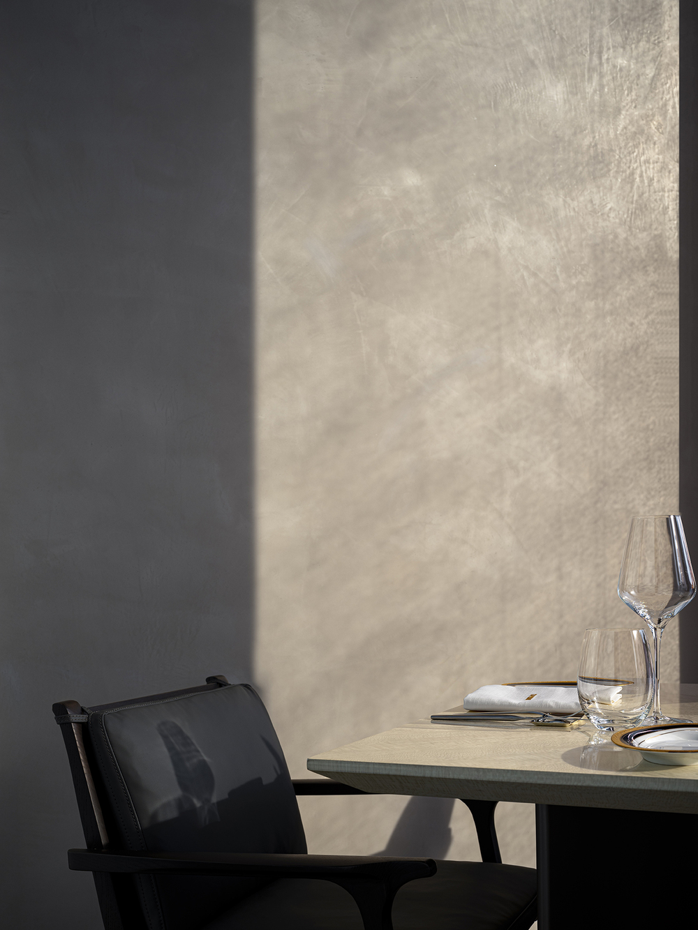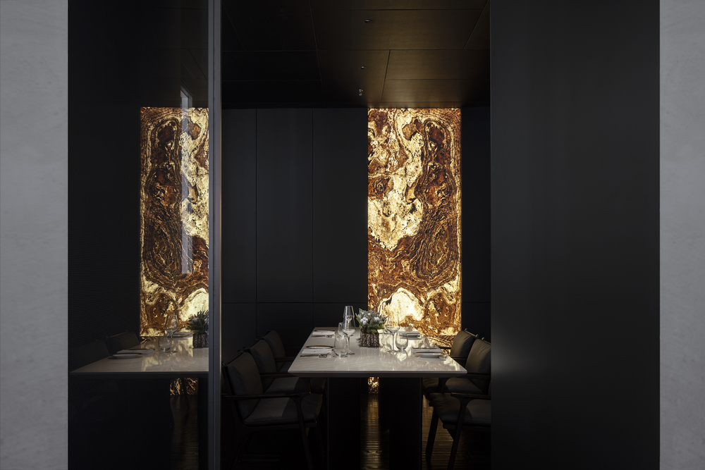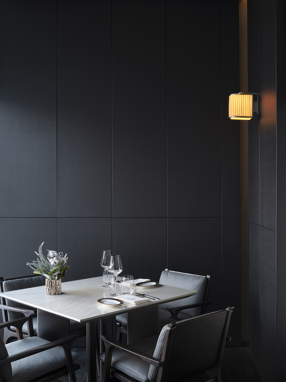 Multiple partitions throughout the space create a tranquil and romantic ambiance, enriching a sense of layering. The glittering translucent stone partitions between the aisle and dining area not only serves a practical function but also evokes strength and natural beauty, invoking a subtle sentiment.