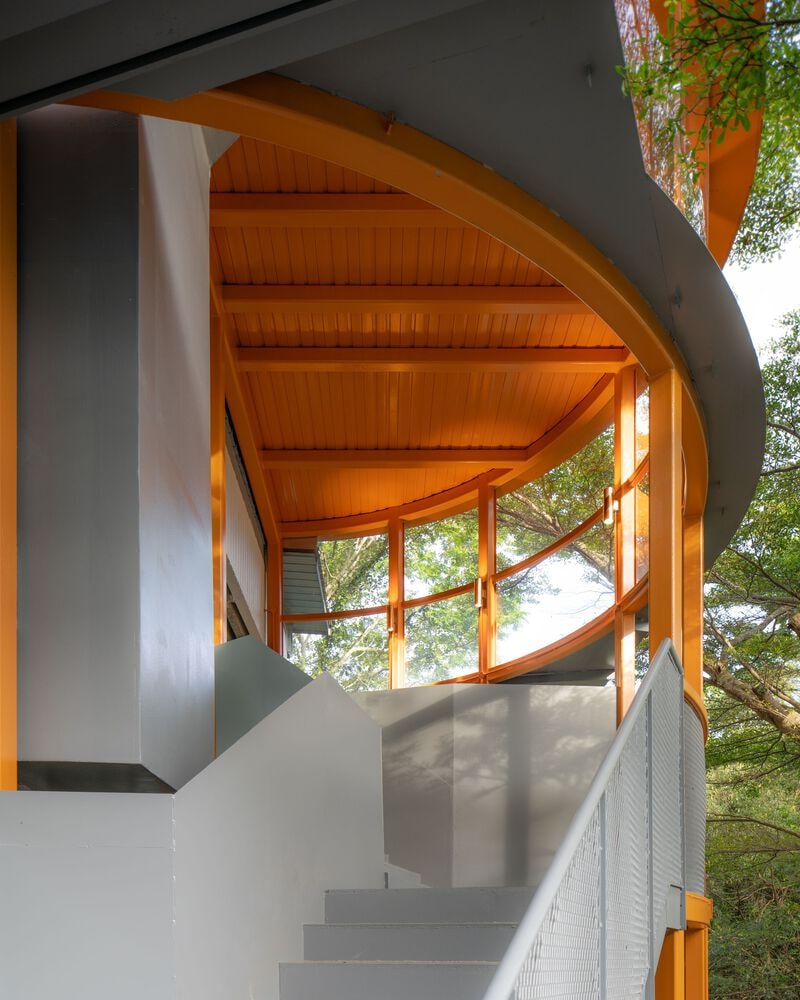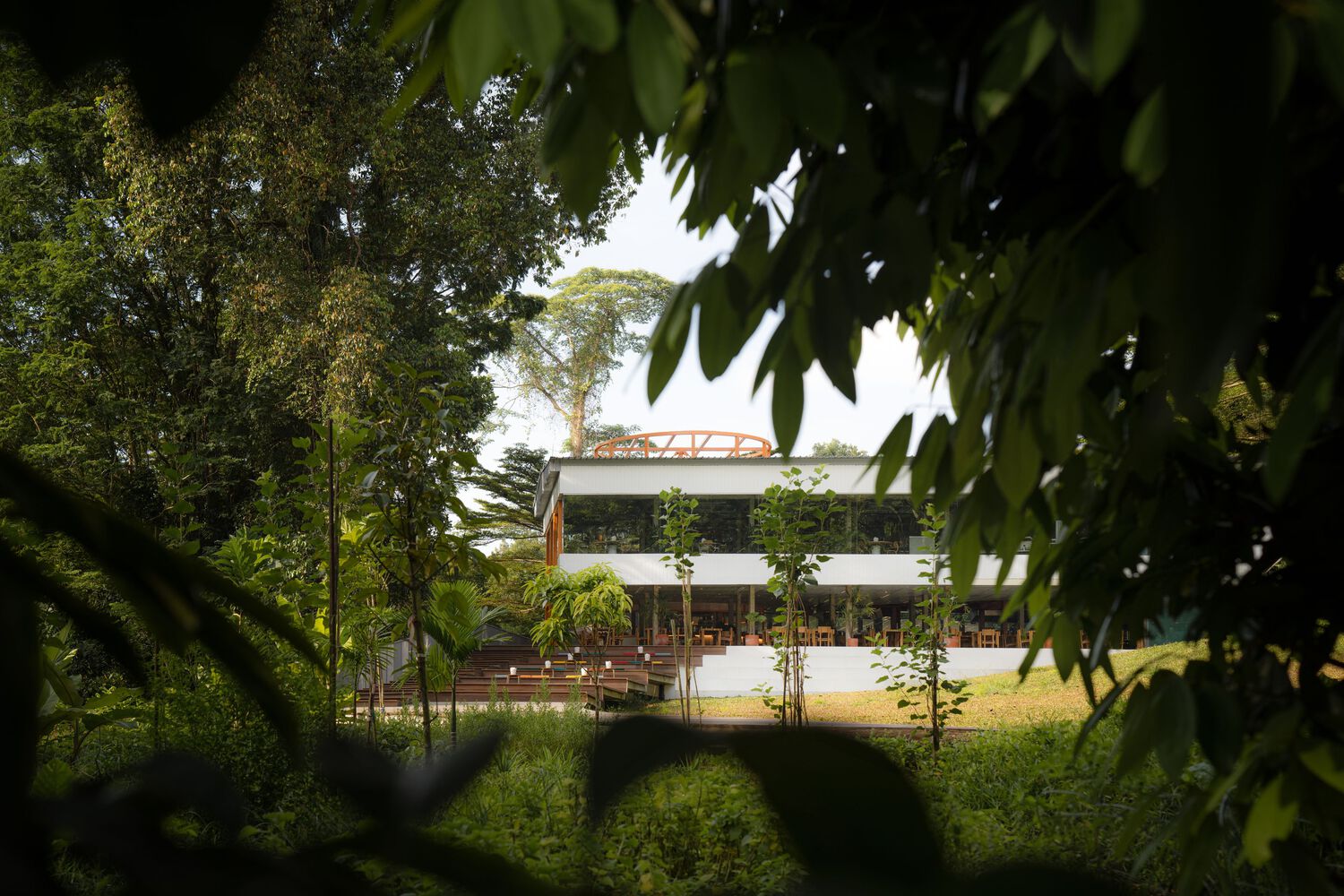 Located in Dempsey Hill, a historic yet contemporary art and lifestyle quarter, the site occupies a 4,000-square-meter green space that was originally a nutmeg plantation in the mid-19th century and later a barrack complex between the 1860s and 1990s. Within this context, the modernist CSC Dempsey Clubhouse, built in the 1970s for civil servant recreation, anchors the campus. While the site’s nature is protected — all trees with girths over one meter must be preserved — the clubhouse itself can be freely reconfigured. This contrast prompted the architects to explore a design strategy that values both heritage and ecology, questioning whether preservation should prioritize only the historically significant or whether architecture can make the ordinary equally meaningful. Minimal interventions were employed to reduce construction waste while celebrating both natural and built elements.