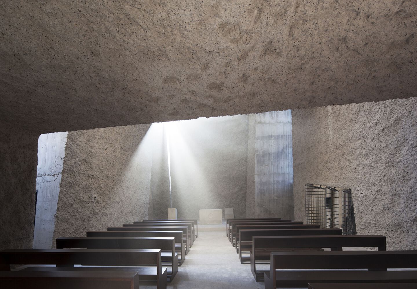 Inside, daylight plays the most important role. Instead of traditional windows, the building is illuminated from above through a cross-shaped opening in the roof. As the sun moves during the day, the light shifts across the interior, highlighting walls, textures, and corners in different ways. This changing light creates a quiet, reflective atmosphere that supports prayer and contemplation.