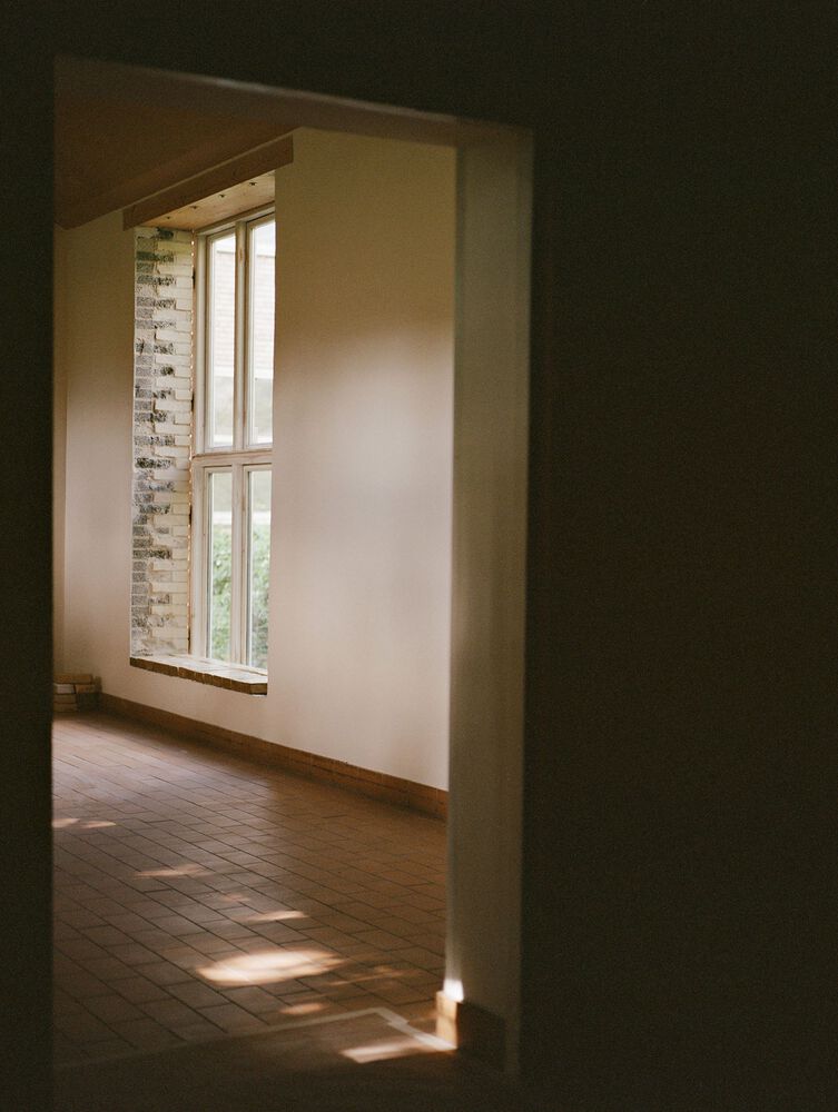 While honoring the building’s introspective qualities, the transformation also sought to make the chapel more open and welcoming. A significant gesture was the reuse of a large reclaimed window sourced from a construction site in Amager. Restored and integrated into the façade, it introduces daylight into the former funeral preparation space, transforming a once-closed area into a luminous interior room suited for new forms of occupation.
