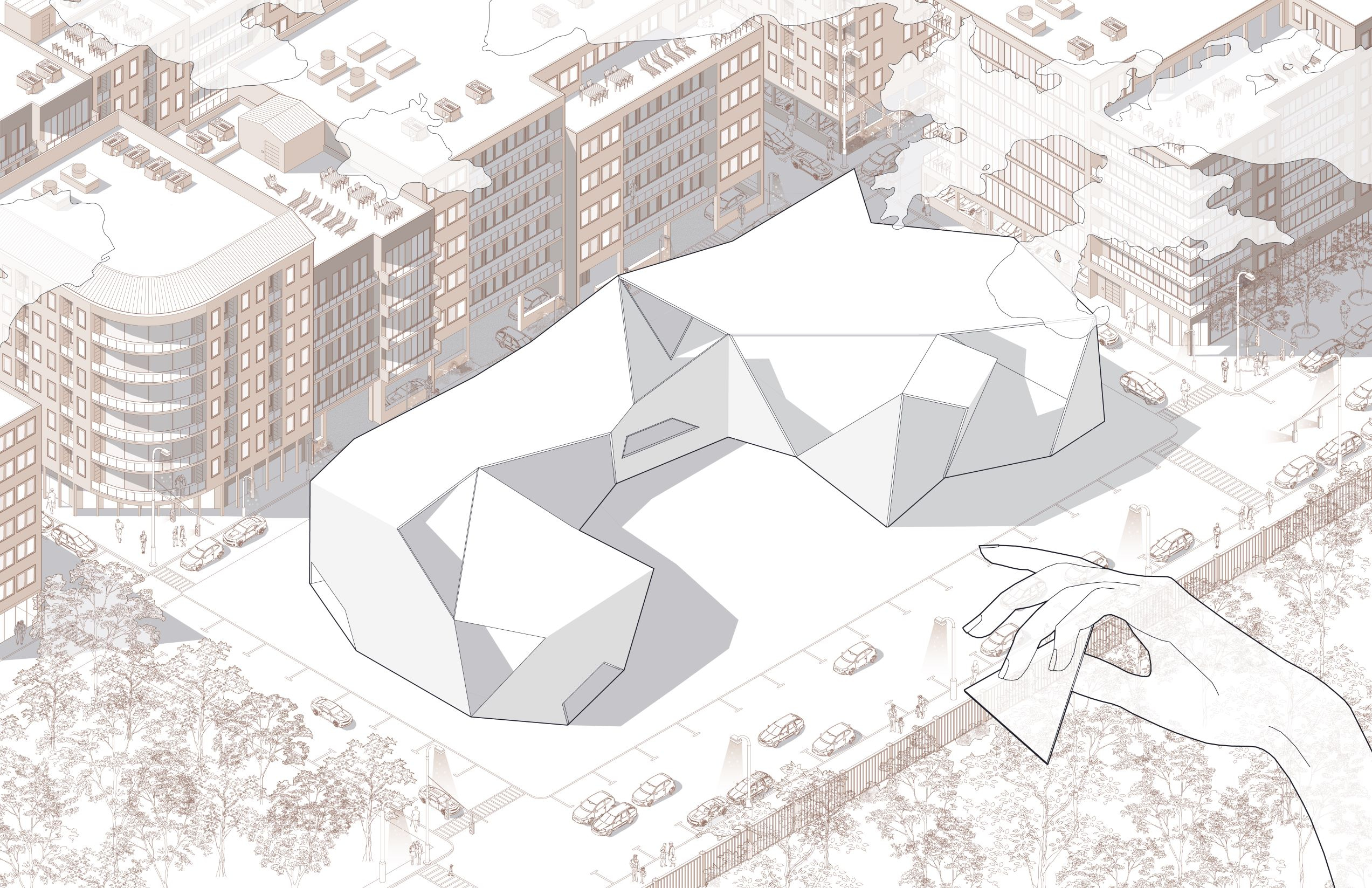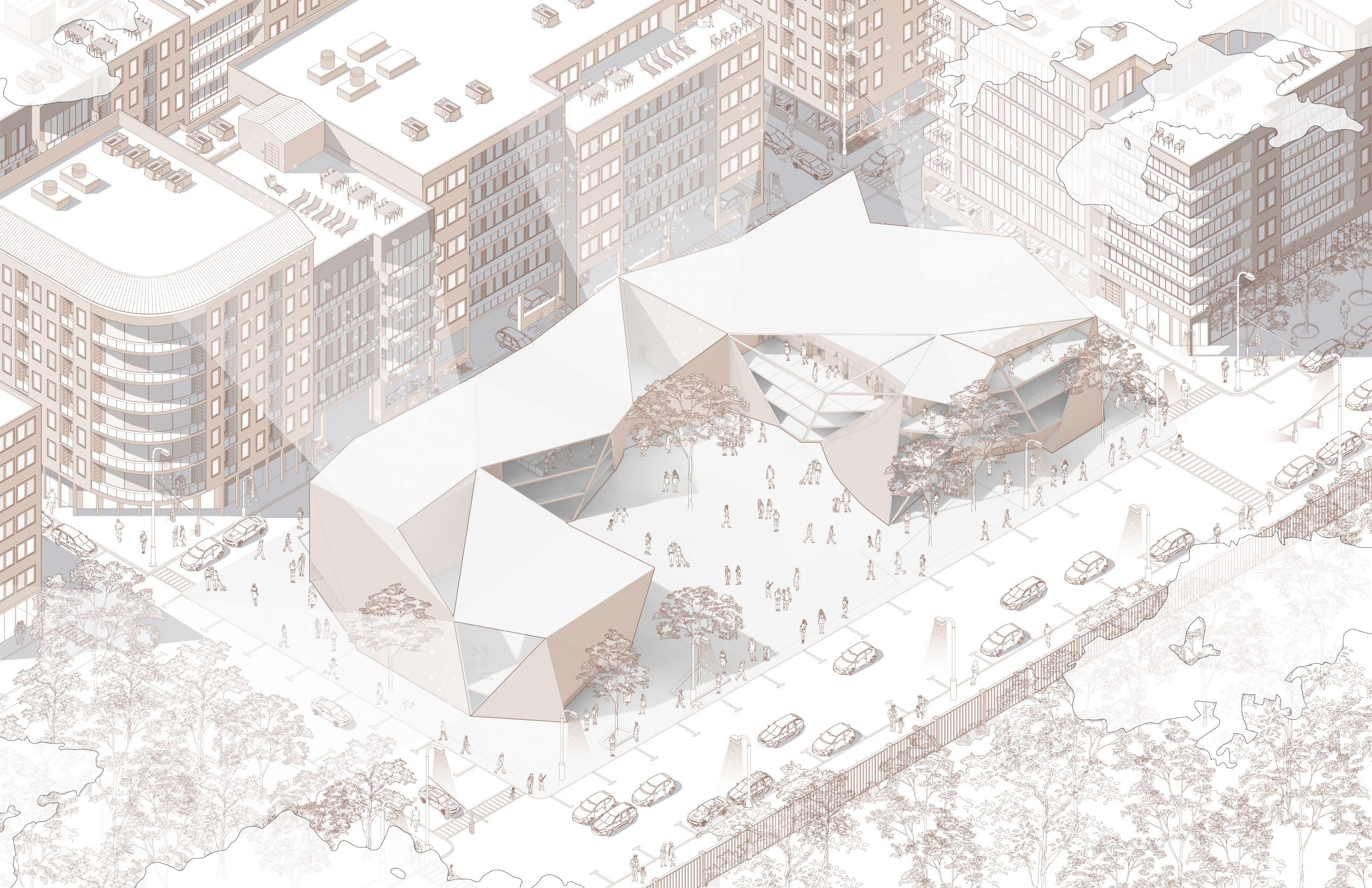 As a mental health healing ground, ae inpatient is both a community center and youth inpatient facility. Ae inpatient is inspired by the nature of recovery through mental illnesses itself, with a rigid, oppressive exterior structure that represents the beginning stages of depression and an expansive, healing interior representing the beginning stages of recovery. Triangular panels were chosen to redirect the view of pedestrians and patients towards the edges of their view frame, to move their eyes up. On the outside, these panels expand the building’s envelope to encroach on the public space.