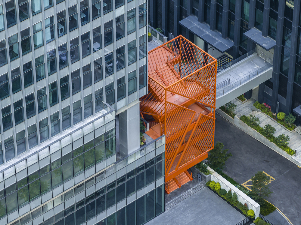 An orange box with a striking color and intricate geometry is positioned in the outdoor area of the site. It penetrates through the six-story commercial plaza, breaking away from conventional dull office buildings. Additionally, sunken steps are used to create a clear connection with the outside. This provides a smooth passage and circulation for pedestrians and escalators alike. In the future, this space will be utilized for activities such as art exhibitions, creative pop-ups, and avant-garde forums. It will be a place for the free exchange of ideas, seamlessly blending arts, humanities, and digital creations within the architecture.