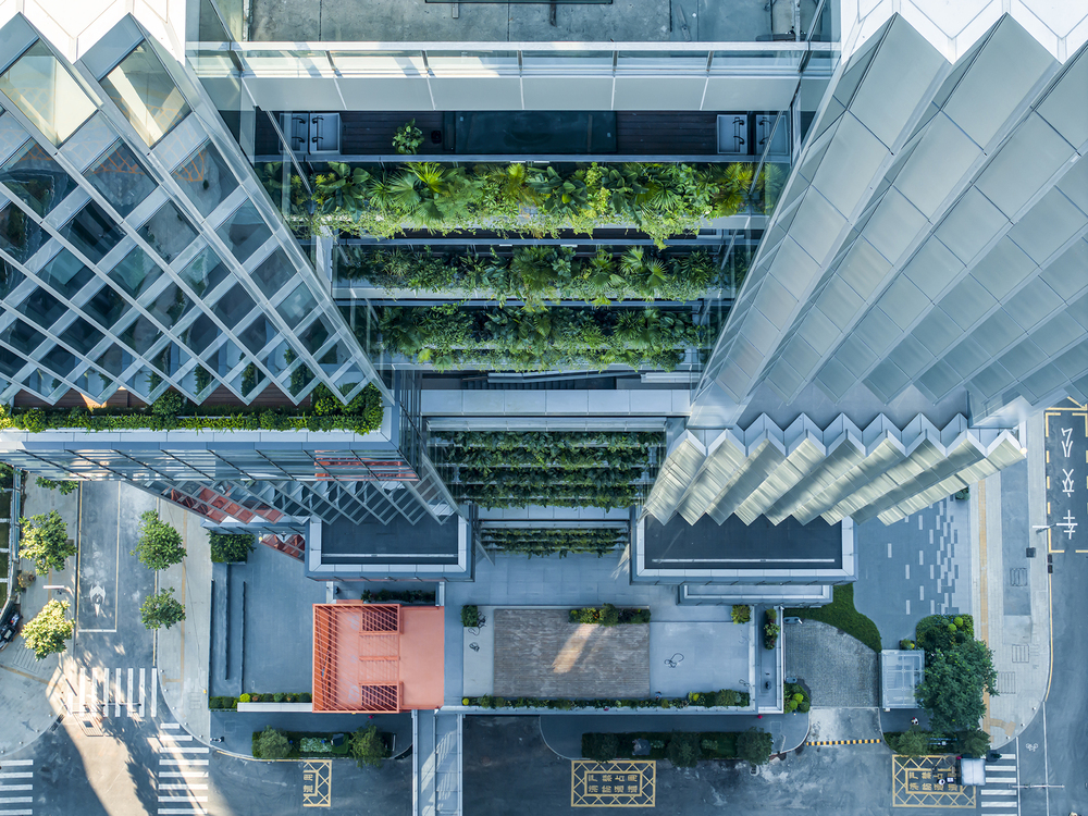 This commercial complex offers a unique spatial layout that’s different from the conventional office design. Instead of separate floors and units, the space is divided into three public functional blocks that are interconnected with a vertical green ecological system. This sustainable and smart structure creates a complete ecosystem that seamlessly blends work, life, and leisure. It allows people to reconnect with nature without having to leave the city.