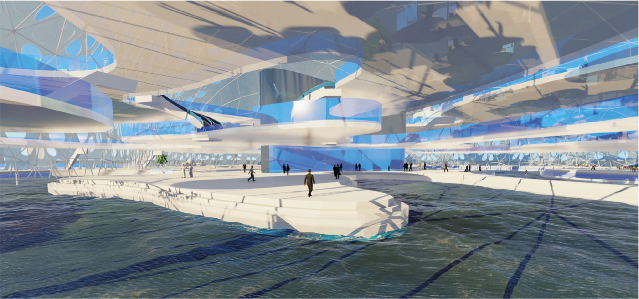 Adapting to nature, a fish cell structure became an initial architectural element defining the spatial conditions for plans to celebrate the marine life in the ocean. The digitally tooled plasma membrane was modelled/ scripted in Rhino/ Grasshopper, as a double curved skin façade made of upcycled ocean plastic debris separating the outside from the inside. Simultaneously, the scale and site through its tectonic conditions were also to be clarified and to perceive these parameters I walked a track in the snow at the Umeå river – literally sketching the 1:1 footprint with my feet. Further design developments such as photographs, models, sketches, drawings, computer models, mappings and computational scripts became an interrelated narrative process including technical physical experiments of platform floating behaviour. Further explorations of patterns, units and typologies were digitally processed into 2D plotted or laser-cut units and were assembled into physical models or 3D printed. The project is mainly modelled/ scripted in Rhino / Grasshopper, 3ds Max, AutoCAD, Revit, V- ray, Unreal Engine and Lumion for final renderings.