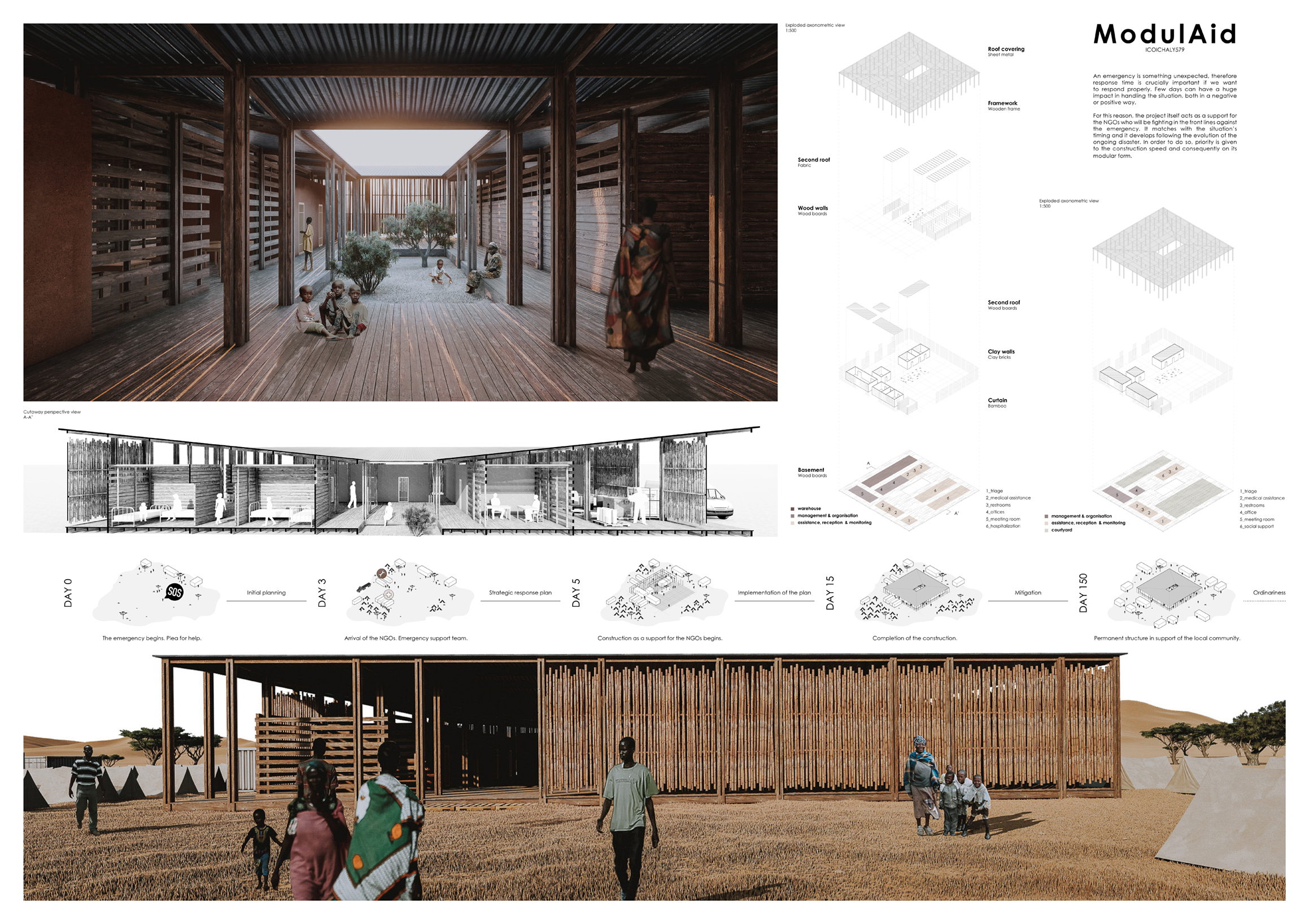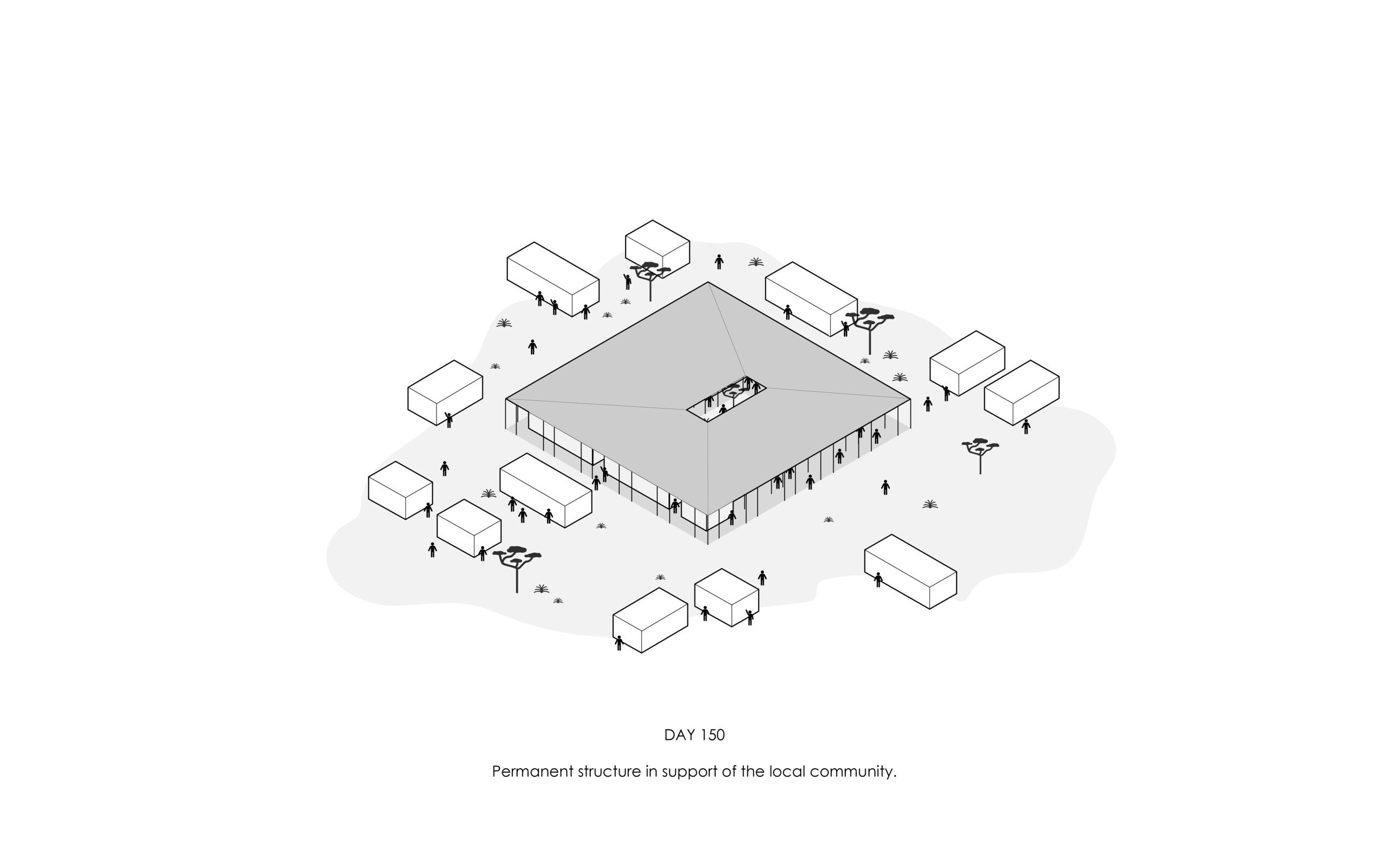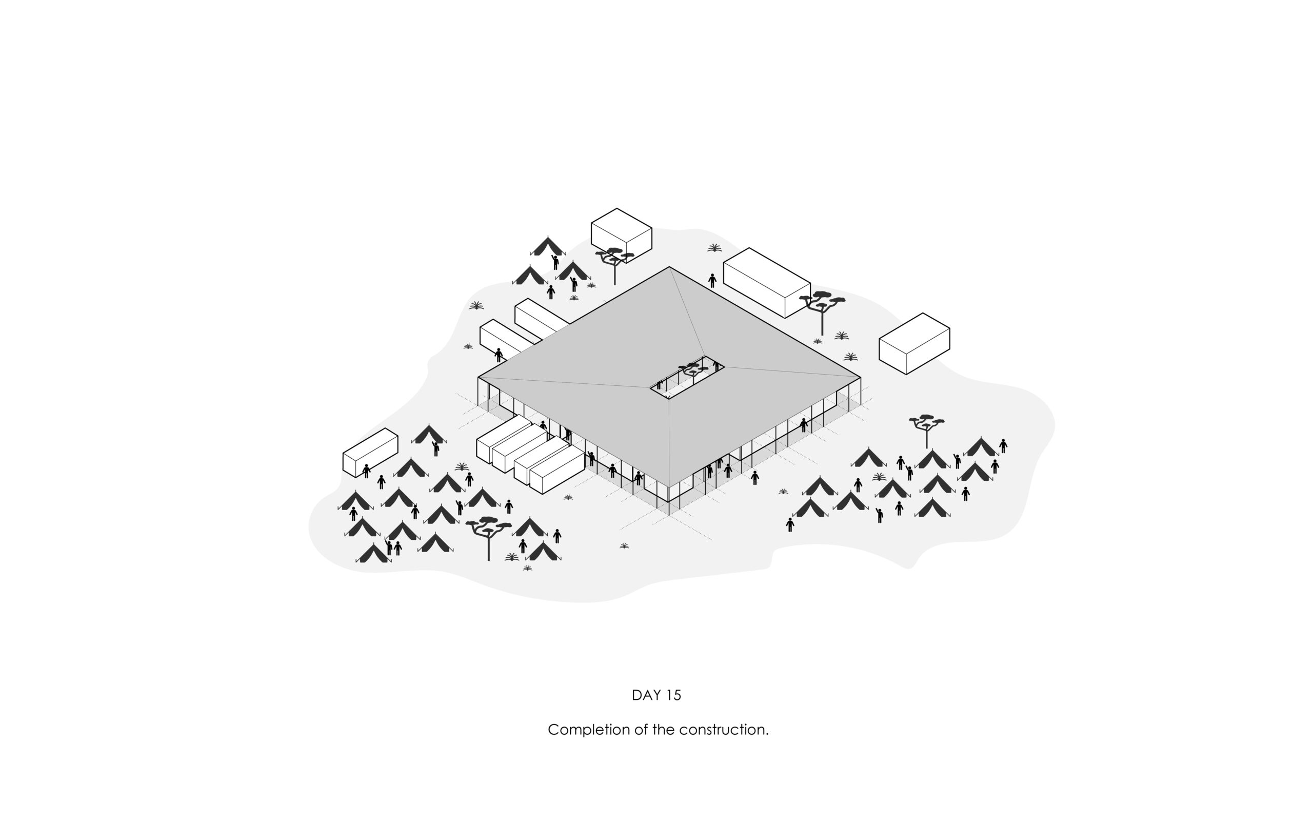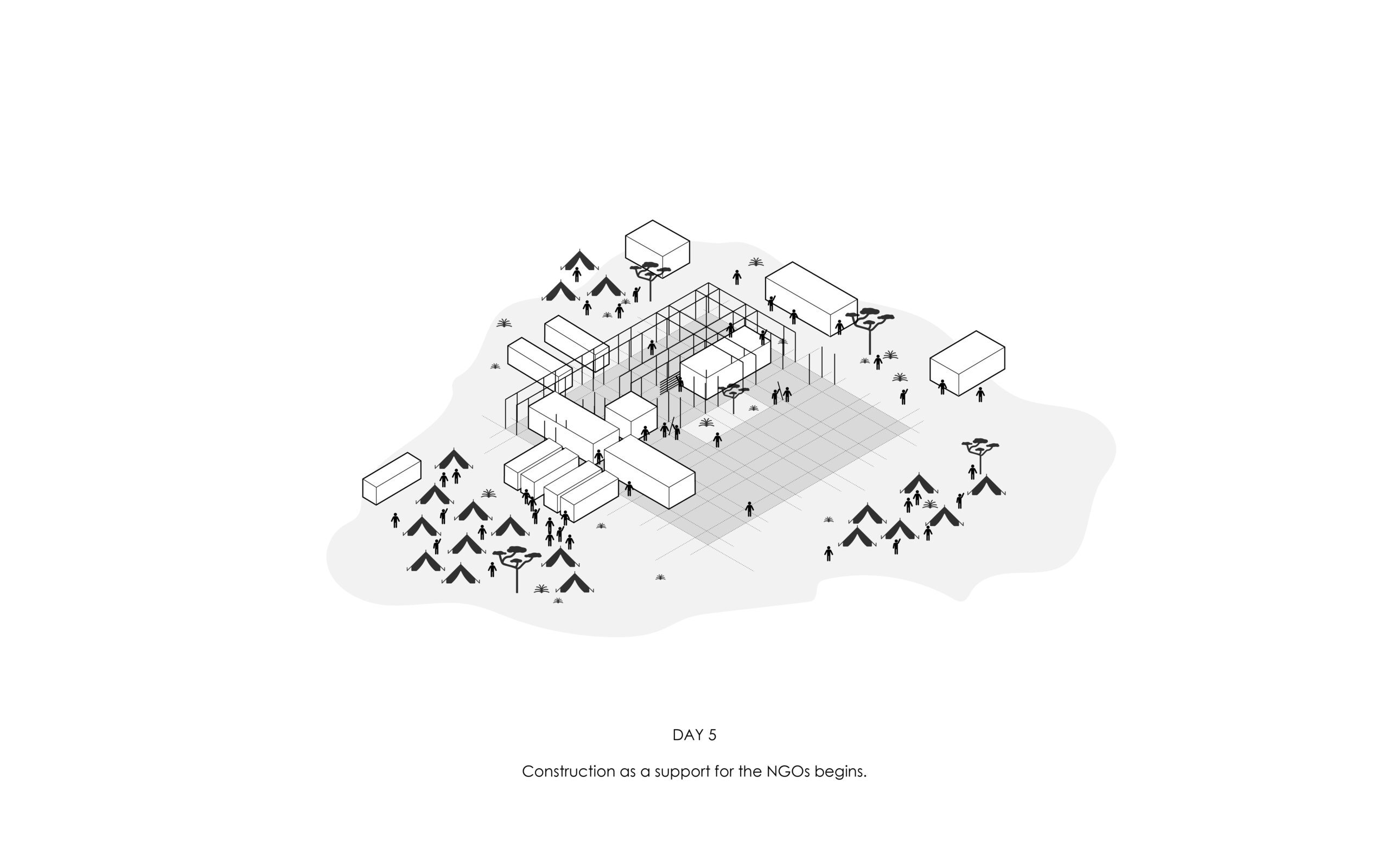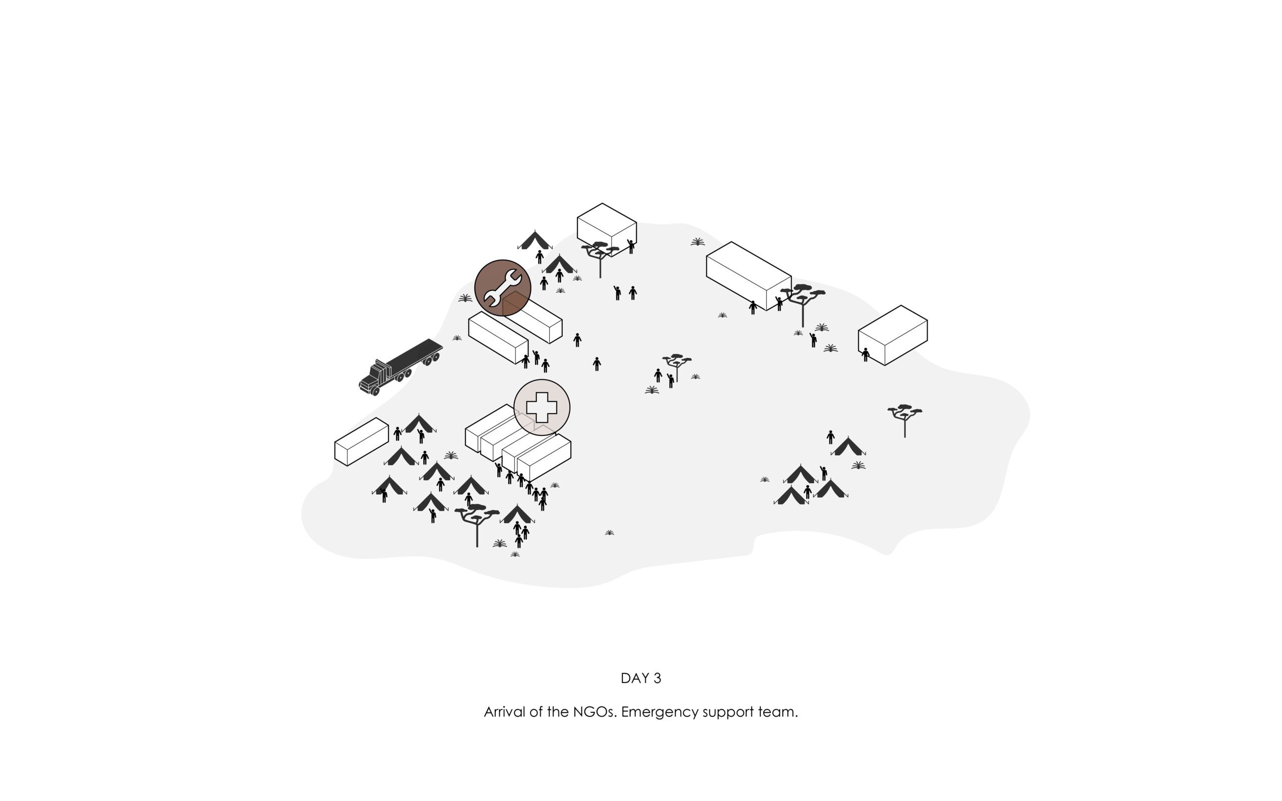 For this reason, the project itself acts as a support for the NGOs who will be fighting in the front lines against the emergency. It matches with the situation’s timing and it develops following the evolution of the ongoing disaster. In order to do so, priority is given to the construction speed and consequently on its modular form. This will allow to replicate the project in various scales in relation the dimensions of the disaster and on the numbers of people involved.