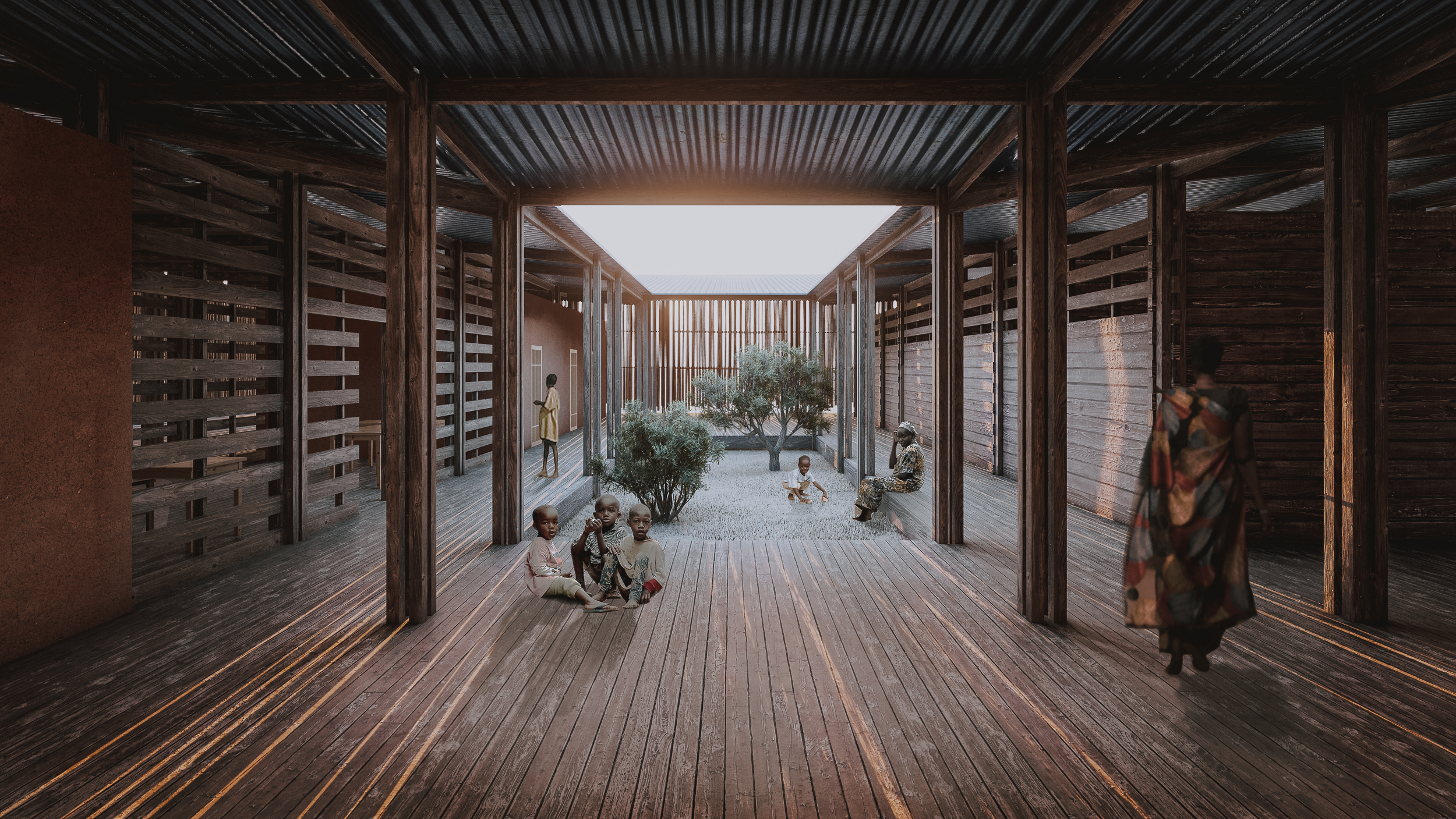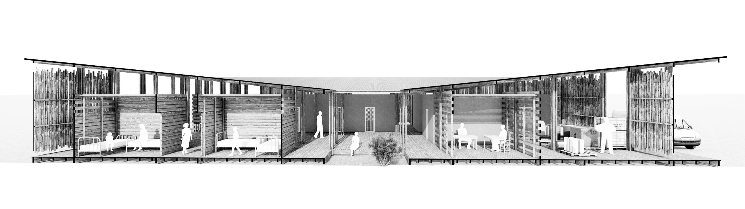 The chosen materials are mainly four: concrete, clay bricks, wood and bamboo sticks. The wood would be used for the main structure of the external “box”. The bricks would be used to build the permanent elements, which will become medical centres, conference and managing rooms. The temporary boxes would also be made of wood and they would be functioning as recovery and monitoring rooms for patients. The perimeter would be enclosed by panels made of bamboo sticks. They would be movable and removable in order to adapt to the situation. They would be also able to protect from the solar rays. Finally, concrete would be used for the foundations.