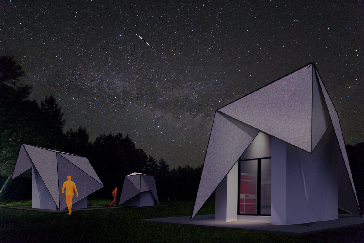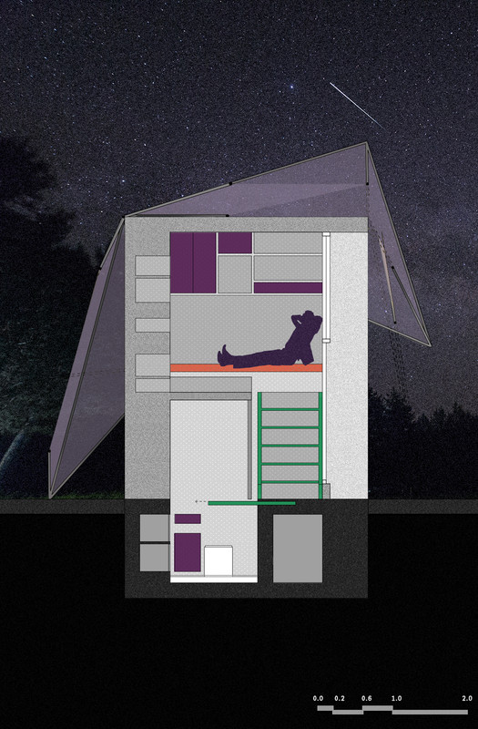 The beds are designed to be folded so they could be used as sofas in the morning hours. In the area of the observatory there are storage areas of objects including a telescope, built-in computer screen and as well as an desk. It is noted that an opening is foreseen on the roof of the unit for the use of the telescope. In the basement (depth 1.1 m) there is the bathroom which is under the hatch.