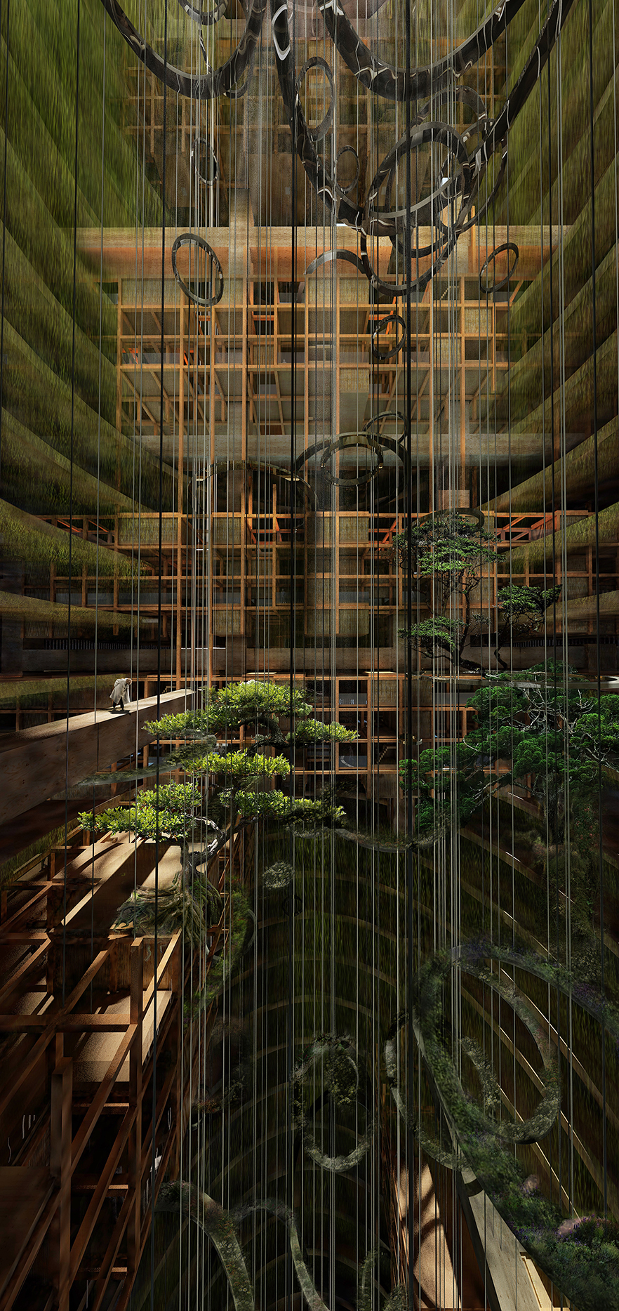 As we escalate the tower, nature overcomes and blends with human life. As humans live in their artificial structures, the rings at the centre provide nurture. The Tower is a monument which celebrates nature and humanity and how they can and should be together.