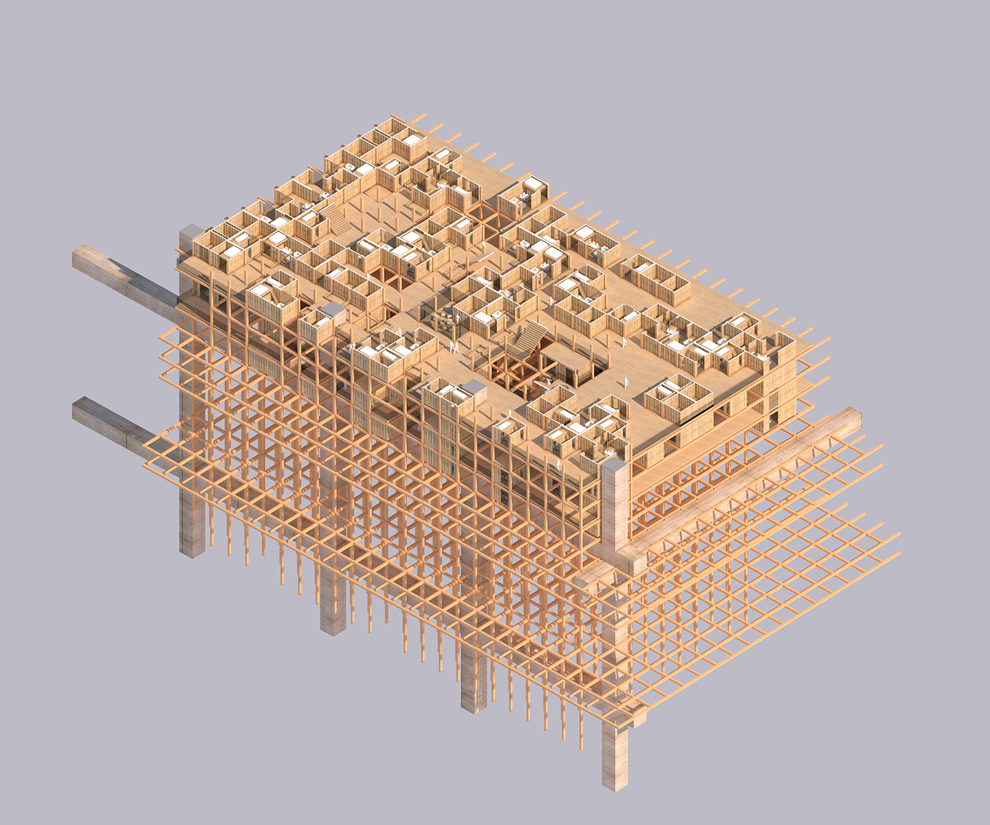 As we arrive at the middle and higher levels, we find a rational wood structure, almost as suspended, hanging. These volumes house people, who live their daily lives in symbioses with the natural surrounding, a natural surrounding which is slowly absorbing the structure the supports it. Some might even think that the structure was done to accommodate it, but the opposite couldn’t be far from the true.