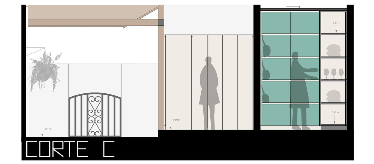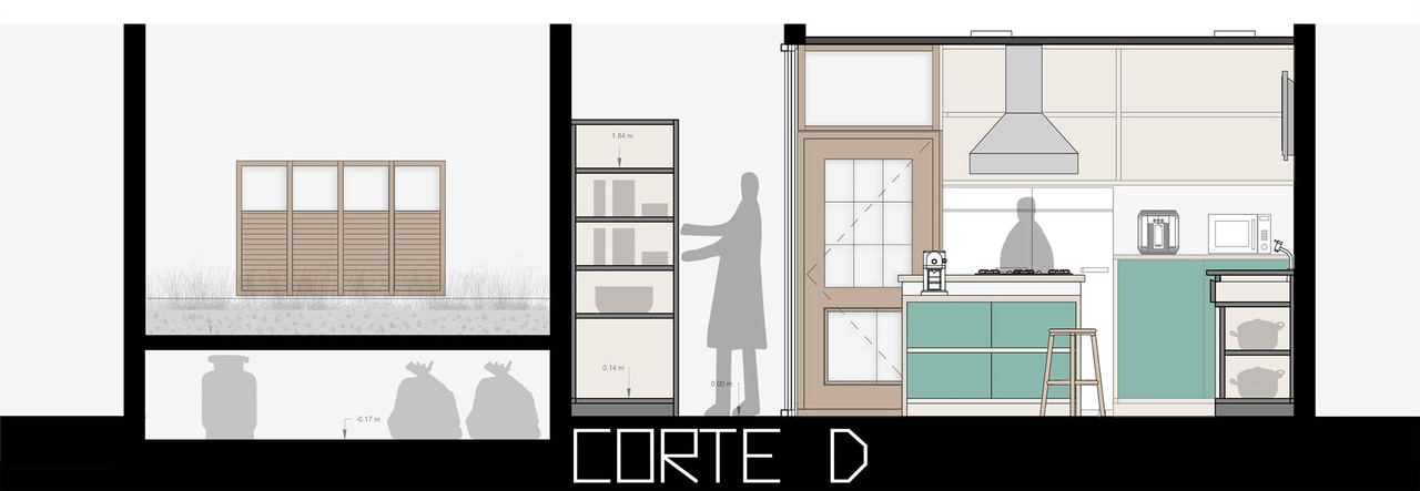 The pantry area was enclosed internally, since it was previously outside the laundry room. This division between the pantry and the laundry allowed the creation of an organized space for laundry on the outside. Two sliding glass doors were included in the limits of the environments, leaving the clients discretion to divide between external or internal. A small garden was also built for the creation of vegetable gardens, with its lower part used for waste and infrastructure.