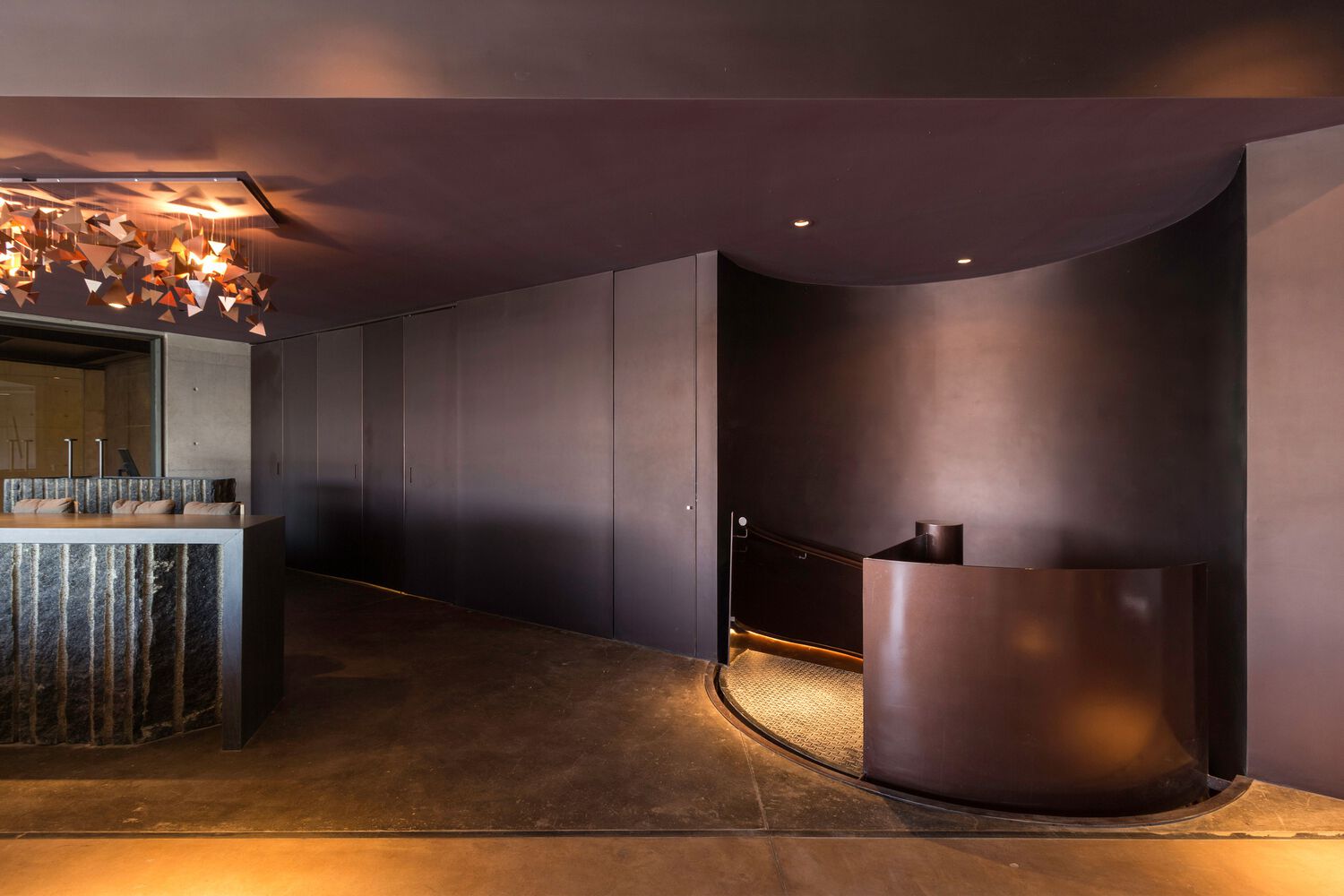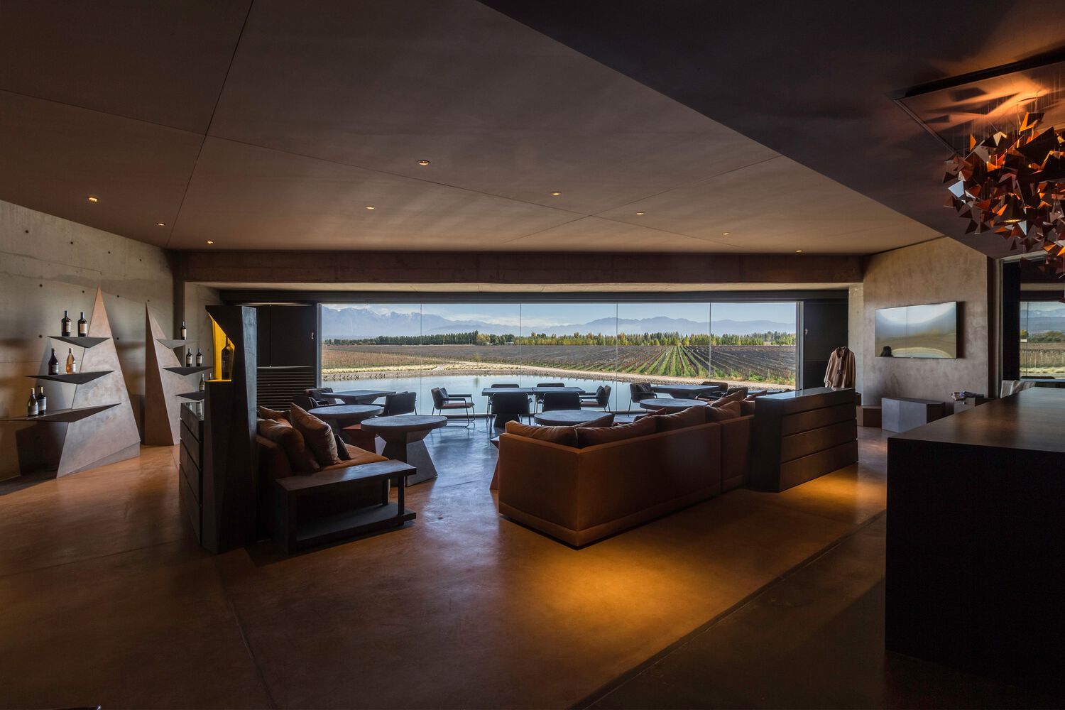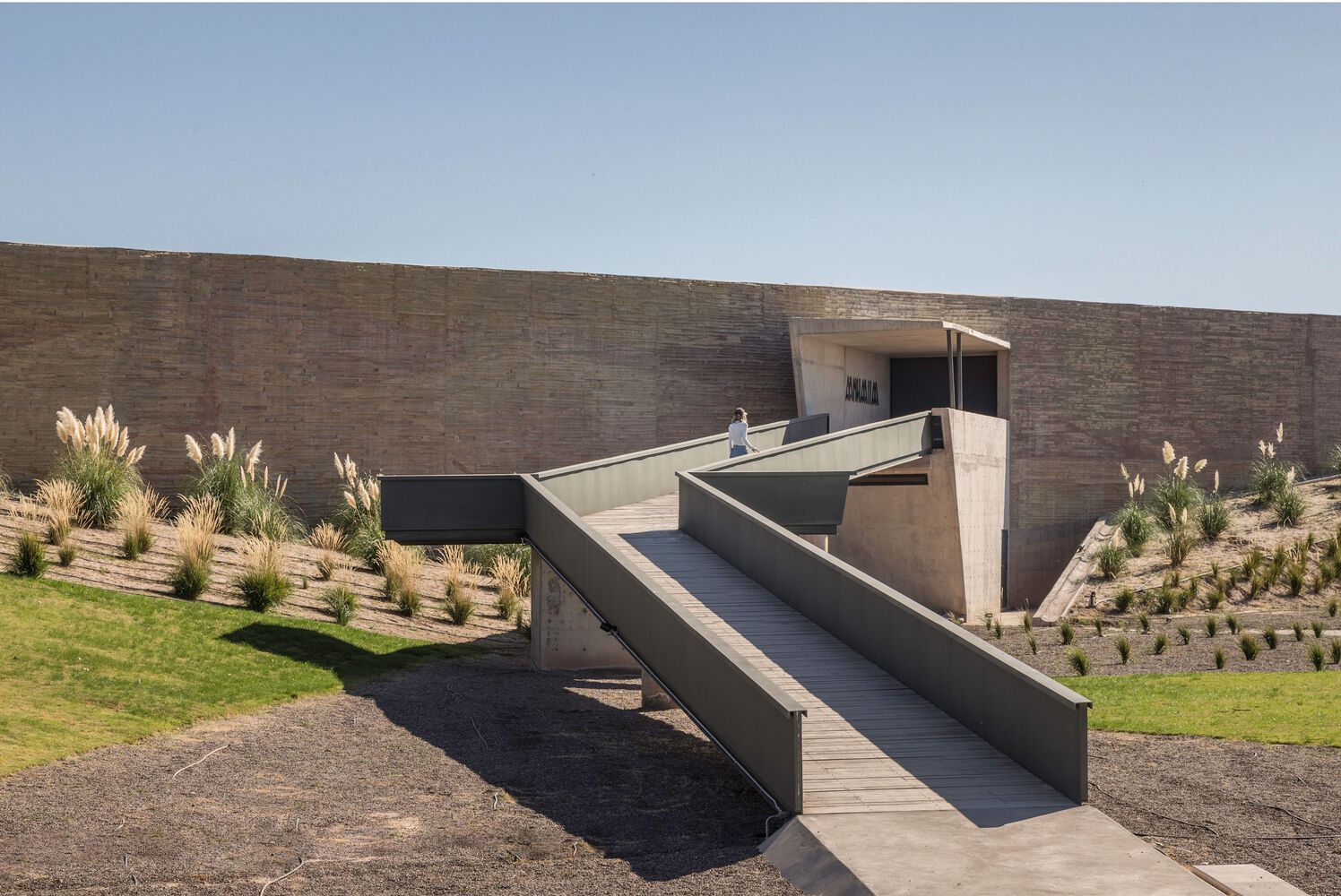 Inspired by the unique terrain and vistas of Mendoza, the winery’s design echoes the region’s mountainous topography, xerophytic flora, and the rich textures and hues of its ancient rocks. The changing earth tones of the landscape are represented in the building’s design, which emerges from the ground like a tectonic fold. This concept is materialized in concrete, paying homage to Le Corbusier’s description of concrete as “liquid rock.”