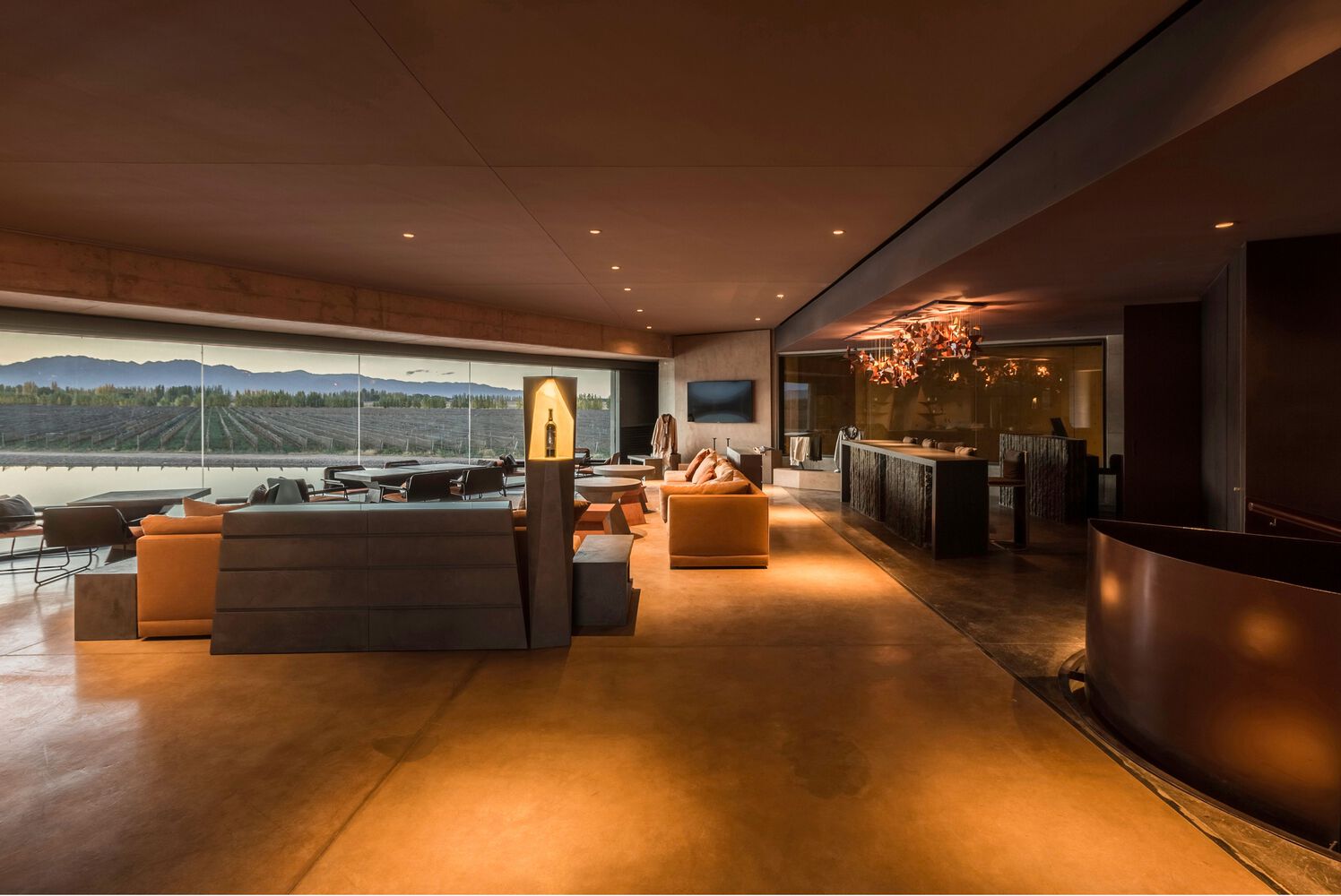 The upper floor is dedicated to the Tourism Sector, featuring a room with a panoramic view of the Andes and a balcony overlooking the Tanks and Barrels room. The ground floor houses a Tasting Room equipped with a sophisticated multimedia installation, which enhances the wine tasting experience by projecting the aromatic descriptors of the wines onto the tasting table.