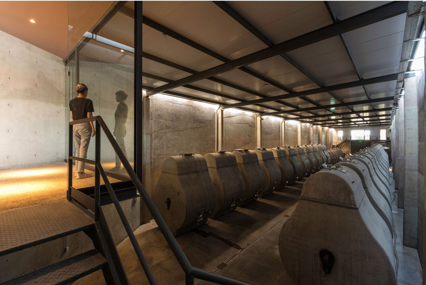 The interior of ANAIA WINES is a testament to architectural simplicity and potency. The building is structured as a rectangular prism, measuring 11 meters in width and 100 meters in length. This design facilitates a linear spatial arrangement of the winemaking process, including the Harvest Sector, Fermentation Hall with tilting concrete tanks, Barrel Hall, Bottle Hall, and Expedition Gallery.