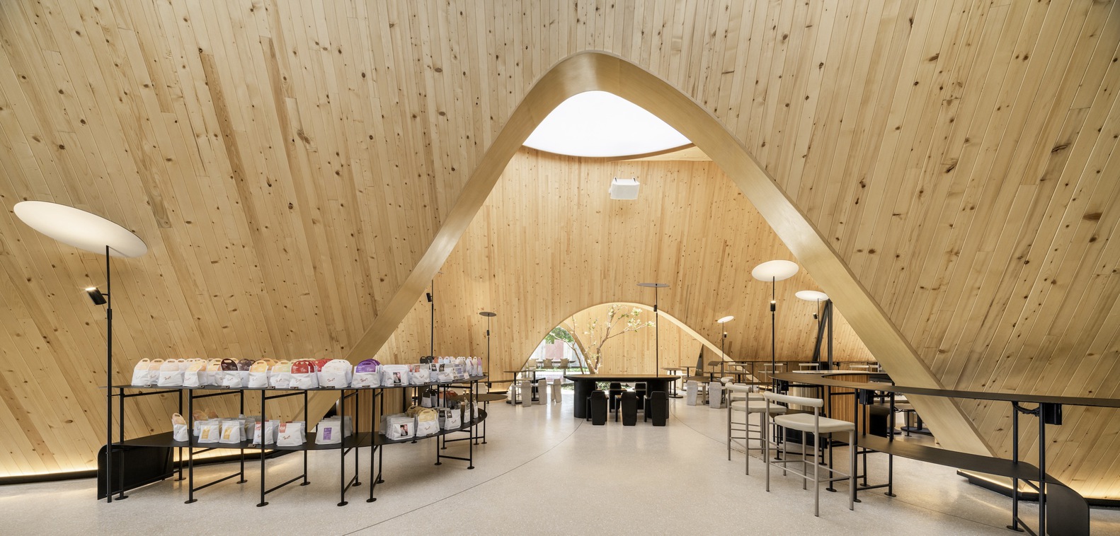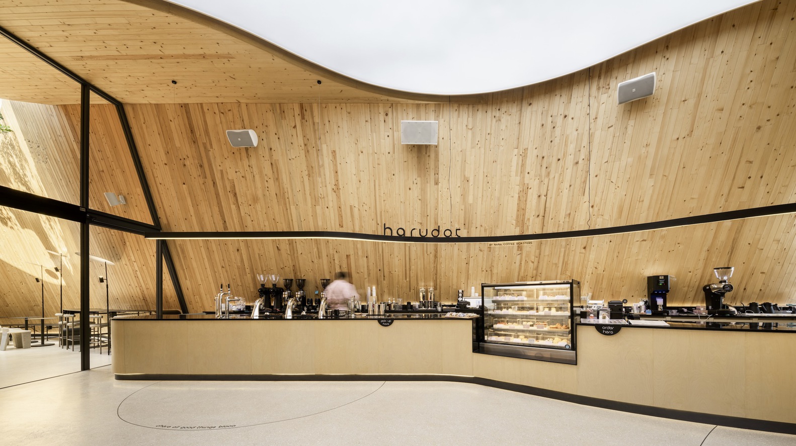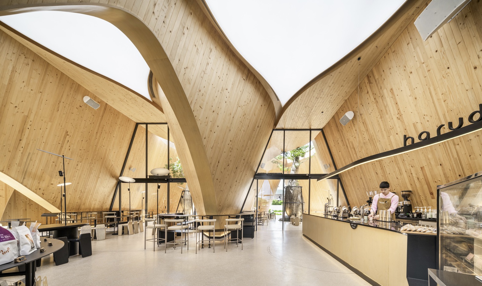 The café’s brand identity draws heavily from Japanese culture, emphasizing humble simplicity and meticulous attention to detail. This influence is evident in the exterior’s design, which features three simple, black-colored gable forms that provide a subtle contrast to the warm pine wood walls of the interior. As guests enter the café, they are guided through a space that morphs and bends with curves, leading them into a more dynamic and memorable area.
